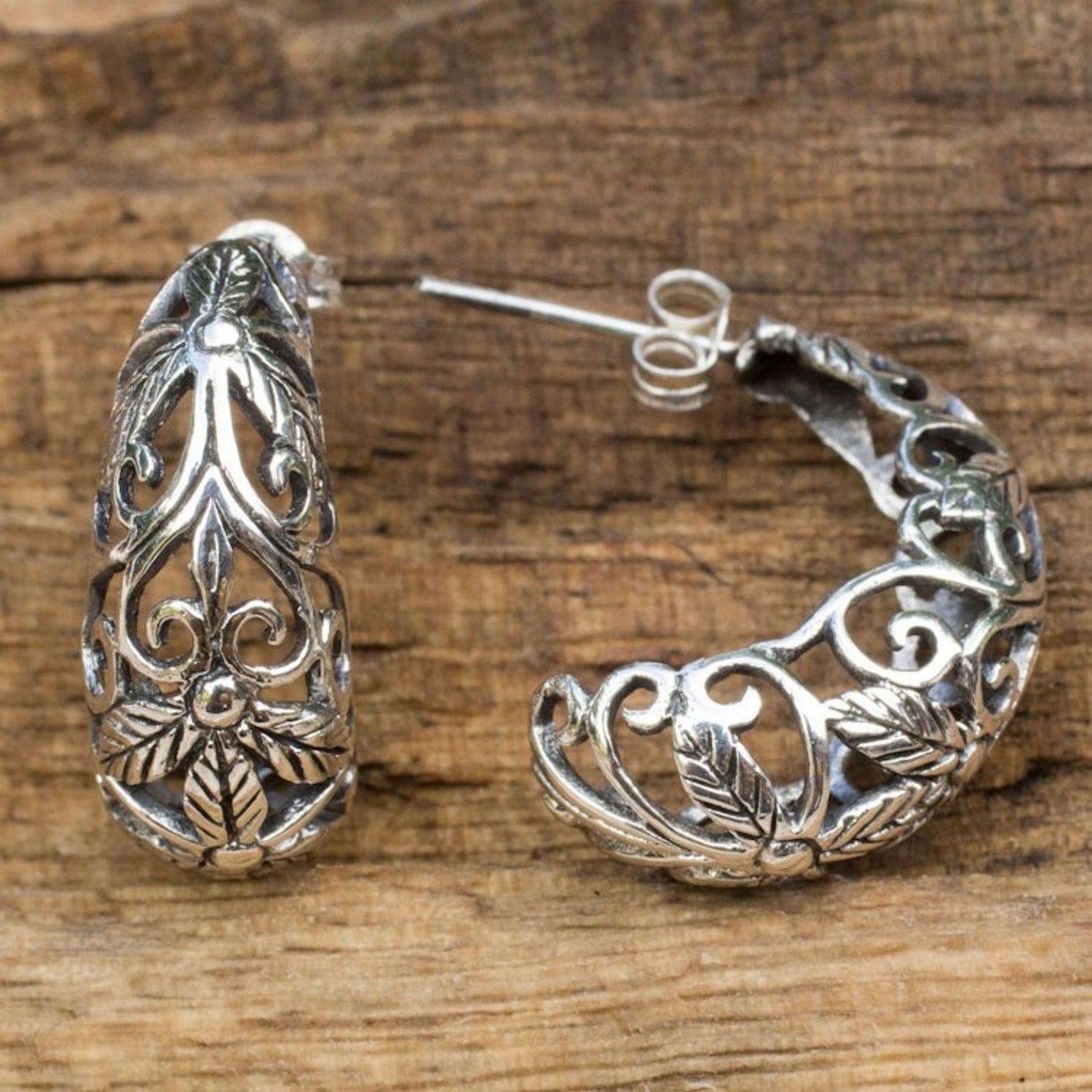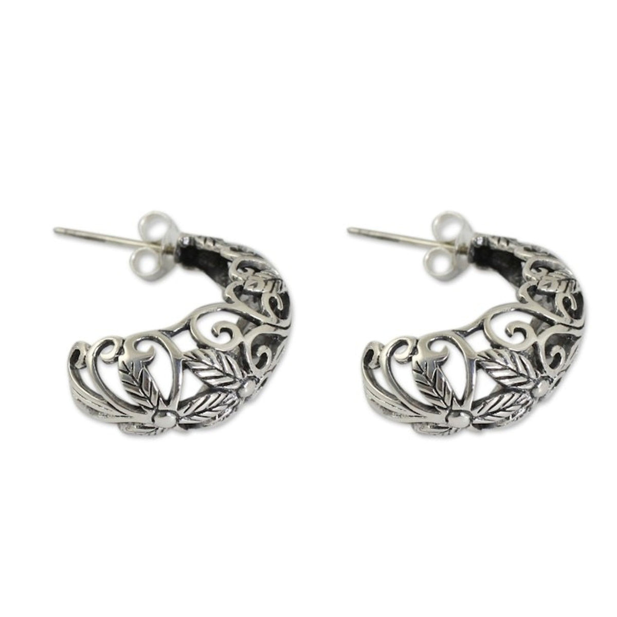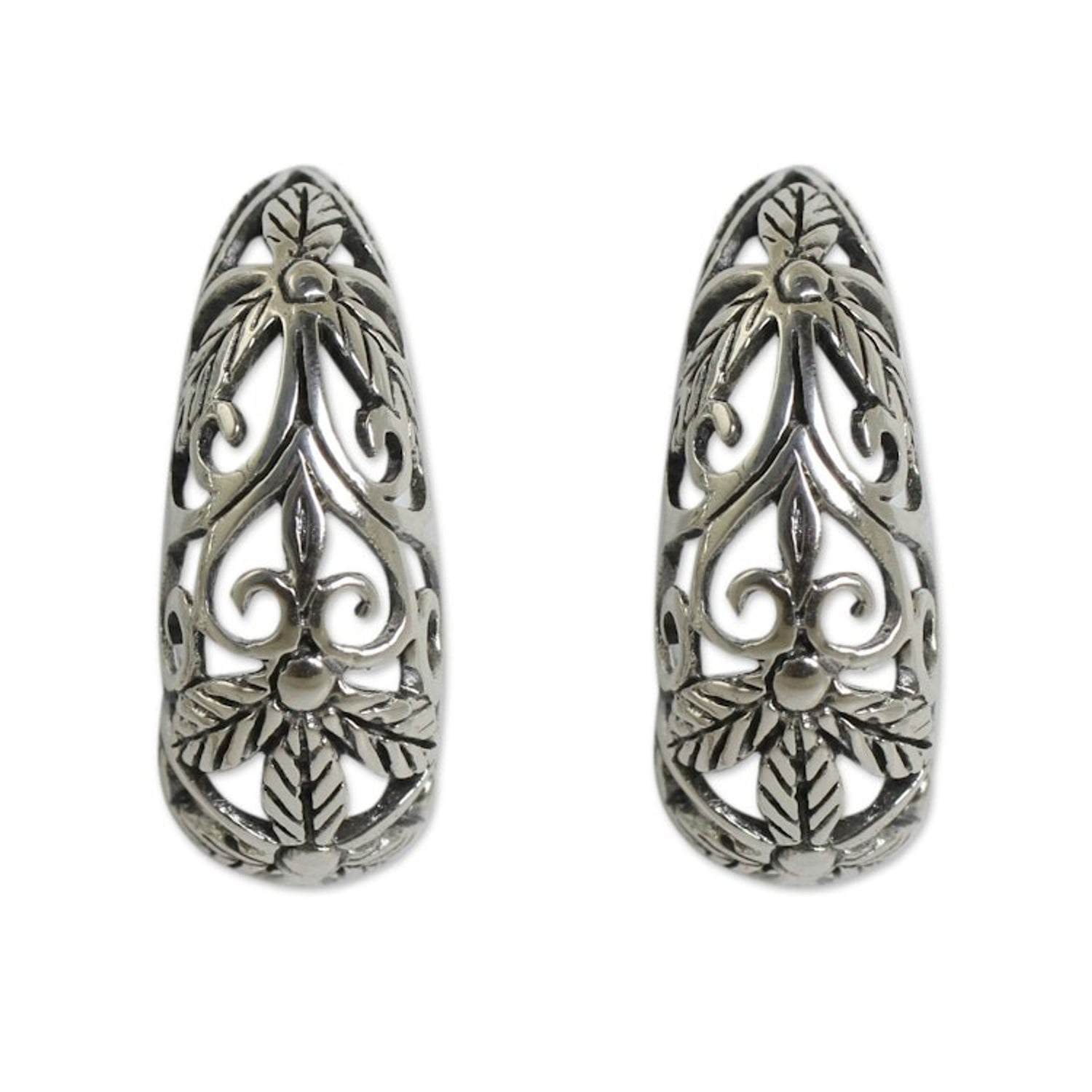 Artisan Crafted Openwork Sterling Silver Half Hoop Earrings 'Floral Fantasy'