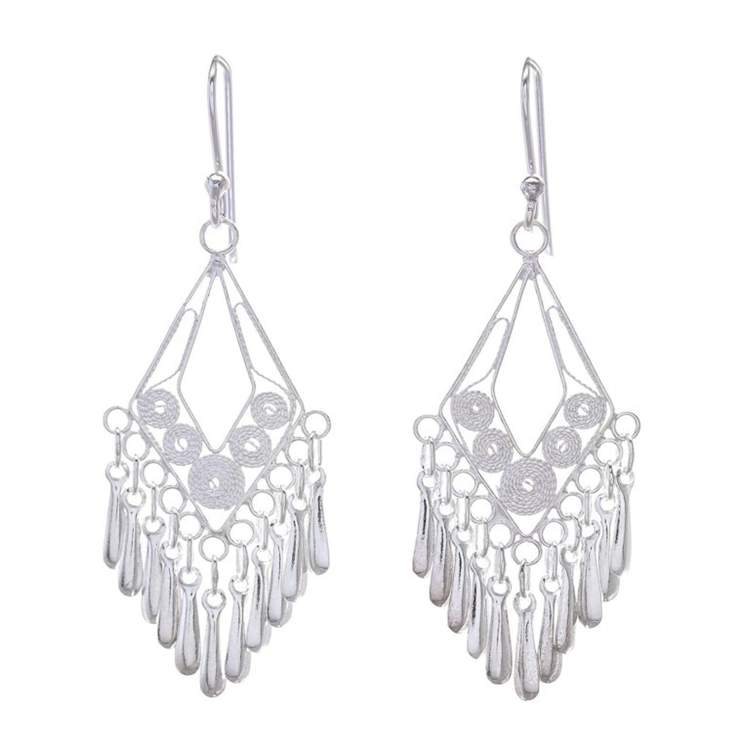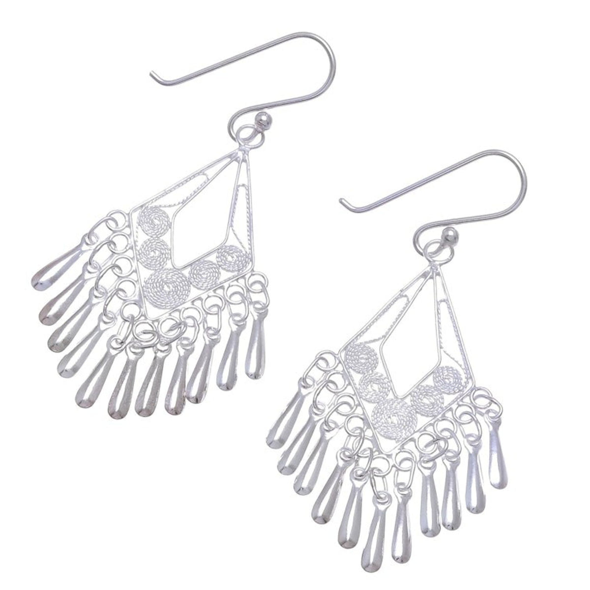 These Diamond Swing chandelier earrings by Thai artisan Wadarat Supasirisuk are a stunning display of filigree work. Gleaming teardrops dangle below intricate diamond shapes, which are crafted by hand from sterling silver filigree. The silver wire is carefully coiled into circular patterns, creating a beautiful and delicate design that swings with every movement.