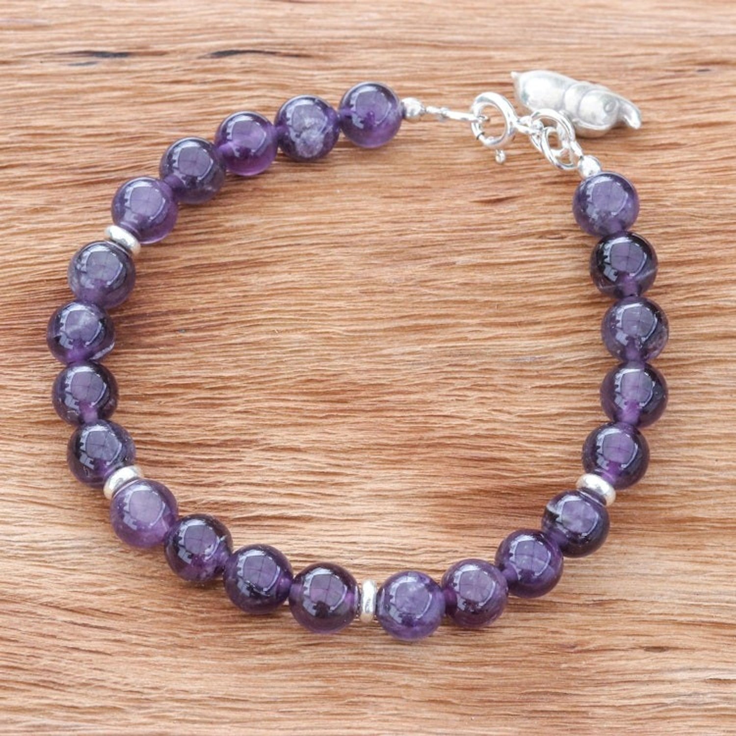 This Wise Grace beaded bracelet by Thai artisan Wadarat Supasirisuk is a graceful and meaningful accessory. It is composed of glorious amethyst stones, which are known for symbolizing wisdom and glamour. The bracelet is crafted with advanced techniques, incorporating sterling and 950 silver details, and is beautifully crowned with a cute elephant charm. It fastens with a spring ring clasp.
