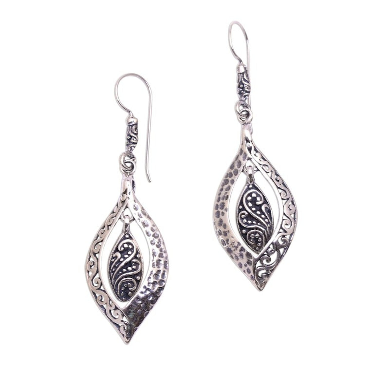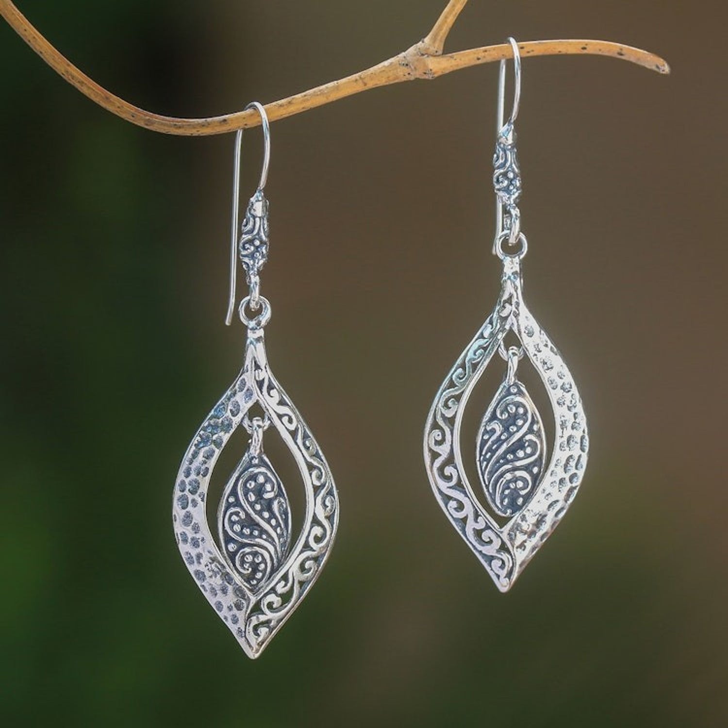 These Baby Leaves dangle earrings by Balinese artisan Wayan Asmana are a wonderful accessory with a nature-inspired design. The earrings feature two baby leaves crafted from sterling silver that dangle within larger shapes. The combination of finishes adds a striking contrast, making the intricate details of the leaves stand out.