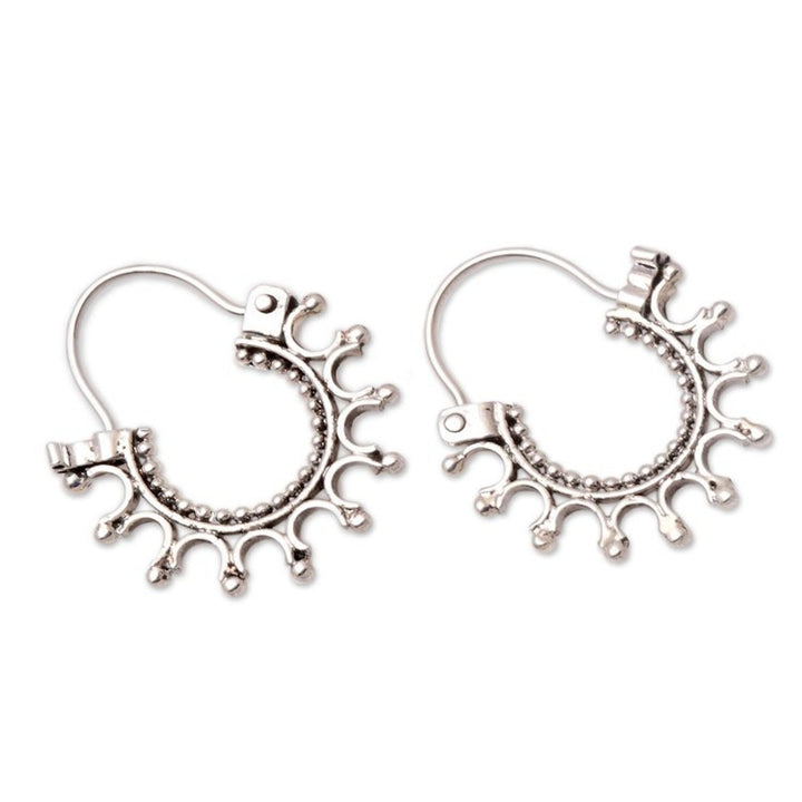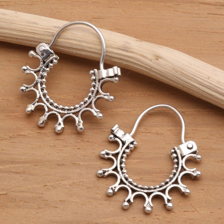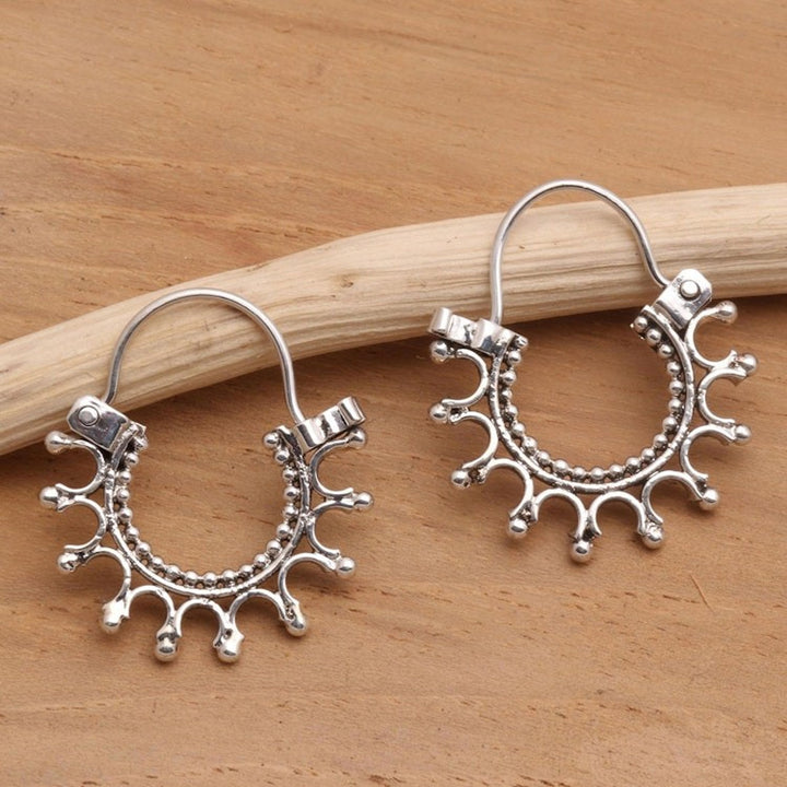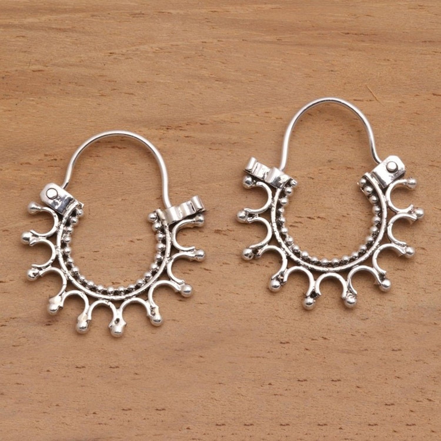 These Radiance hoop earrings by Balinese artisan Wayan Asmana evoke a Balinese dance crown. The airy sterling silver hoops feature scalloped rays topped with diminutive sterling spheres. This radiant design is both traditional and contemporary, making it a beautiful and elegant piece of jewelry.
