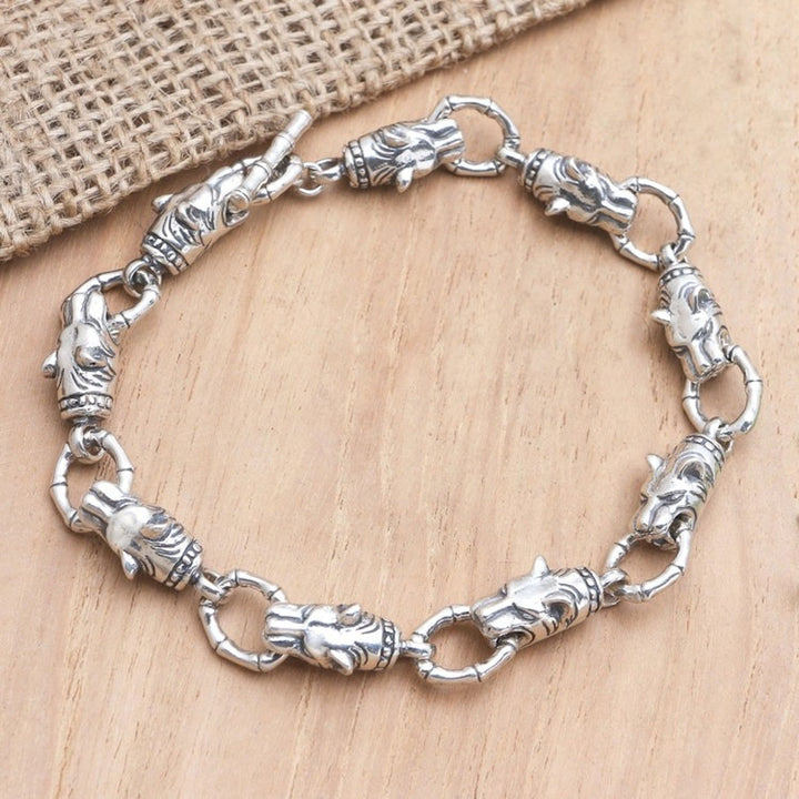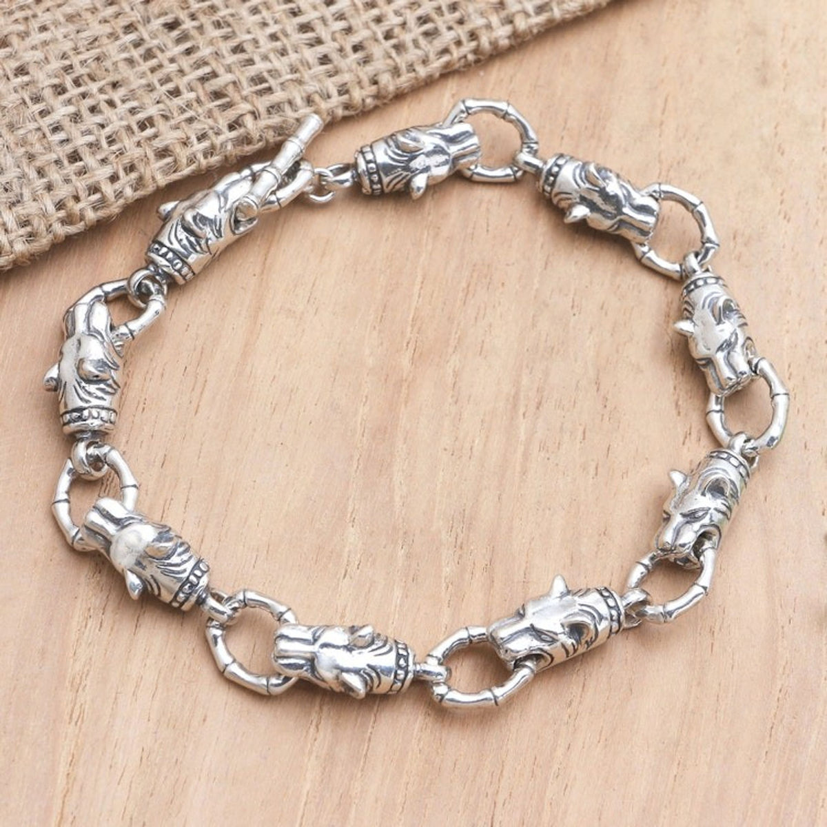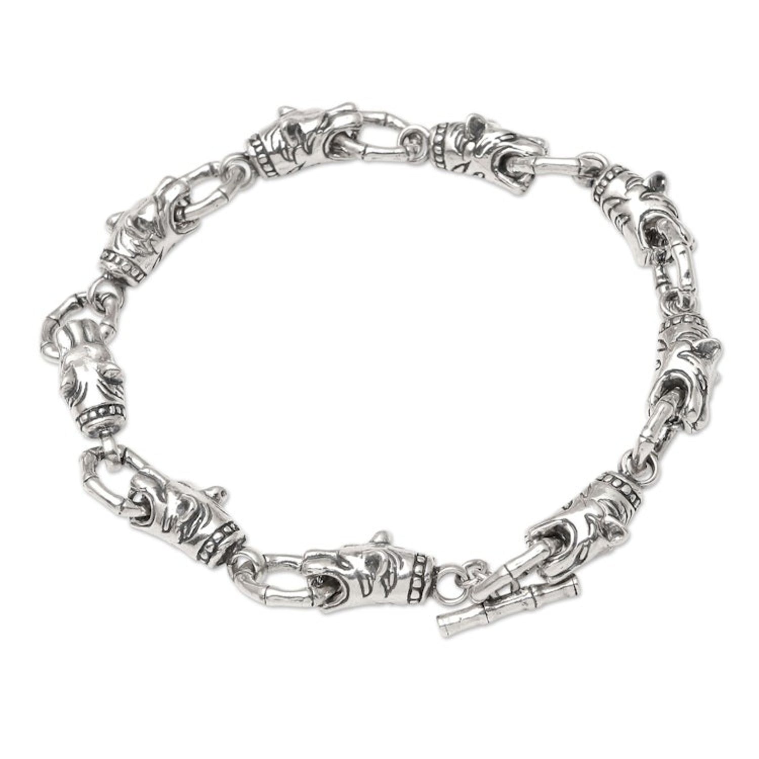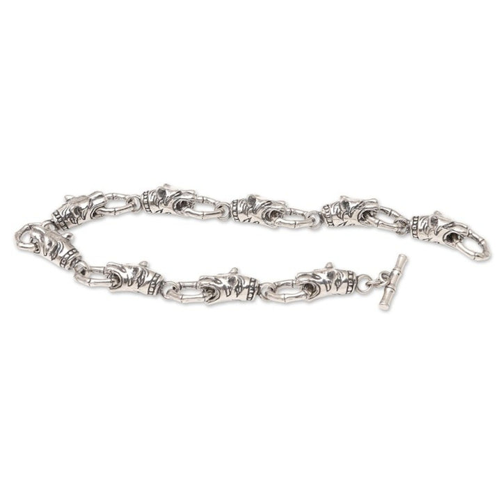 This On the Hunt men's link bracelet by Balinese artisan Wayan Asmana features proud, noble, and fiercely protective silver lions. Said to be the king of the beasts, the lion motif is hand-crafted with a contrasting combination finish on sterling silver links. The bracelet fastens with a toggle clasp.