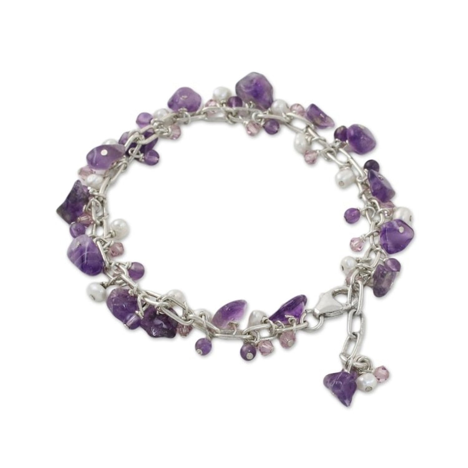 These Amethyst and Cultured Pearl Beaded Bracelet from Thailand 'Violet Dream' by Withaya Cheunjit offer a dreamy, elegant design for the wrist. The bracelet features a delightful combination of dangling amethyst beads and lustrous white cultured pearls, which are threaded along a sterling silver cable chain. This piece is a testament to Cheunjit's love for beautiful beads and gemstones, blending them into a modern and wearable design. The inclusion of an extender chain and a charming accent allows for a comfortable, perfect fit for any wearer.