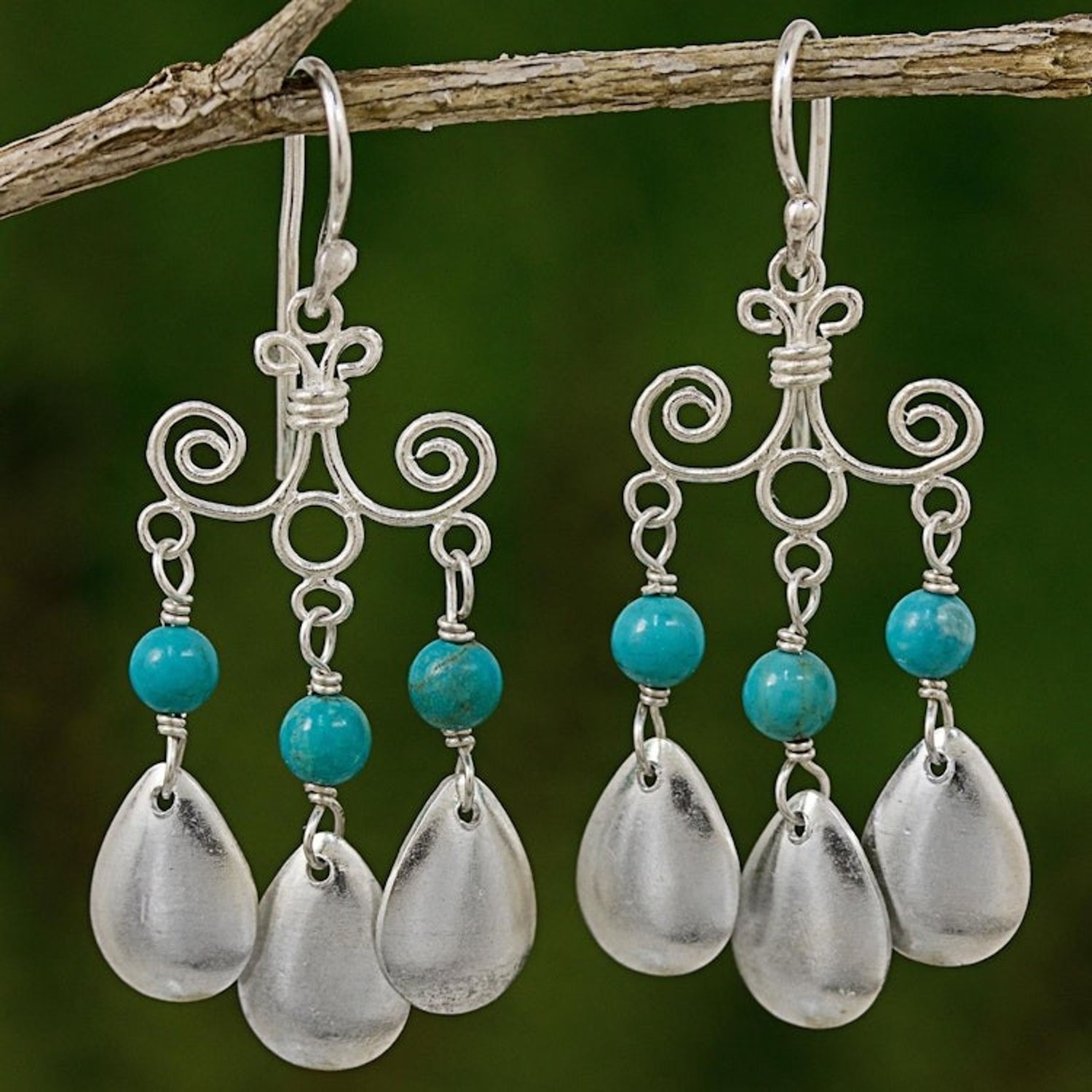 These Sterling Silver Calcite Chandelier Earrings from Thailand 'Blue-Green Sky' by Withaya Cheunjit are a truly marvelous accessory. The design features blue-green calcite stones alongside intricate sterling silver openwork, creating a beautiful chandelier effect. These earrings capture the tranquil and vast expanse of a "blue-green sky," reflecting the natural inspiration behind Cheunjit's creations. They are a collaborative effort with his wife, and their combined artistic vision results in a piece that is both elegant and eye-catching.