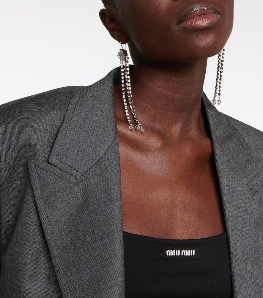 These Crystal-embellished earrings by Miu Miu are a dazzling and glamorous statement piece, perfect for adding an unforgettable touch of sparkle to any outfit. The pendant, adorned with brilliant crystals, creates a stunning, light-catching effect that speaks to a luxurious and celebratory vibe. The design is both modern and timeless, making it versatile for an elegant evening or a special event. These earrings are an ode to opulent glamour, designed to make you feel like the center of attention.