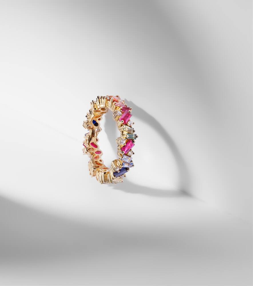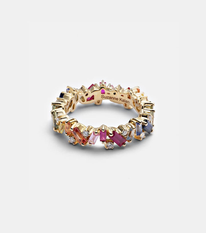 This Rainbow Frenzy 18kt gold, diamond and sapphire ring by Suzanne Kalan is a vibrant and enchanting masterpiece, designed to infuse your looks with a sense of playful luxury. Handcrafted in the USA, the ring features a dazzling eternity band of multicolored sapphire baguettes in the brand's signature 'fireworks' setting, accented by brilliant round white diamonds. It's a joyful and artistic piece that symbolizes a celebration of color and light, perfect for those who embrace bold, modern elegance.