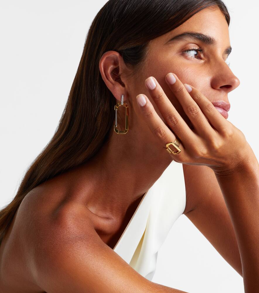 This Chiara Big 18kt gold single earring with diamonds by Eéra is a bold, modern statement piece with a vibrant, architectural aesthetic. Handcrafted in Italy from 18kt yellow gold, its unique carabiner-inspired design is elevated with pavé-set diamonds, adding a luxurious sparkle to its clean lines. This single earring is an expression of individuality and contemporary style, symbolizing a fearless approach to luxury. It’s perfect for those who appreciate innovative design and want a piece that truly stands out.