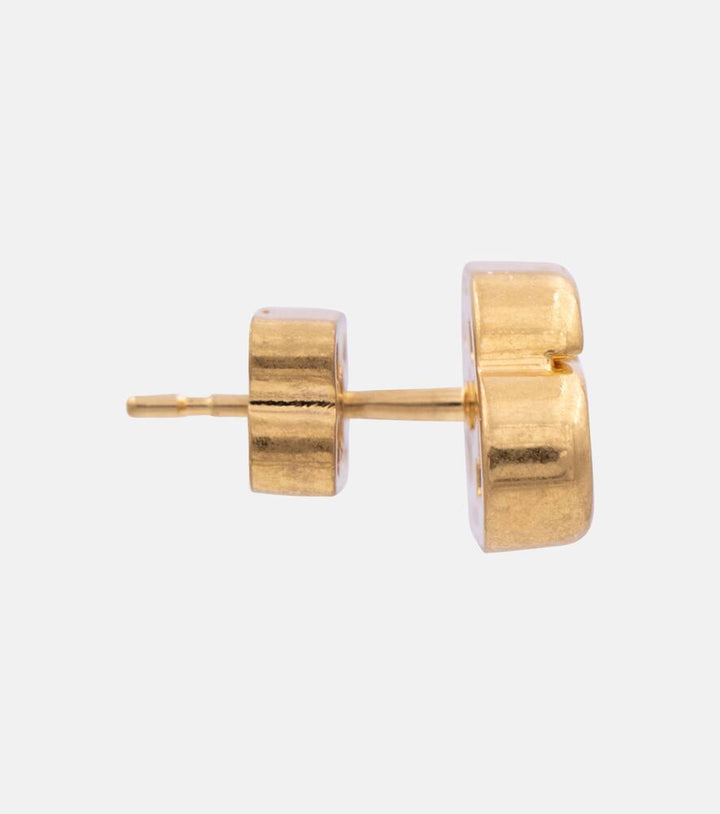 These BB XS gold-plated stud earrings by Balenciaga are a chic and minimalist statement, embodying a sense of modern, subtle luxury. Crafted in Italy from polished brass with a gold-plated finish, the iconic BB logo is a timeless symbol of the brand's heritage and confident style. Their small, discreet size makes them perfect for adding a touch of refined elegance to your everyday look. They are a versatile accessory for any occasion, symbolizing a quiet yet powerful sense of sophistication.