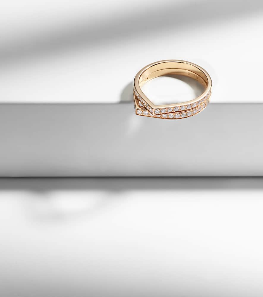 This Antifer rose gold ring with diamonds by Repossi is a luxurious and modern statement, with an off-kilter, wishbone design that is truly unique. Crafted in Italy from 18kt rose gold, this ring is beautifully lined with 0.52 carats of pavé-set diamonds, adding a touch of brilliant sparkle. It's a piece that combines contemporary artistry with timeless elegance, making it an ideal gift for yourself or a loved one.