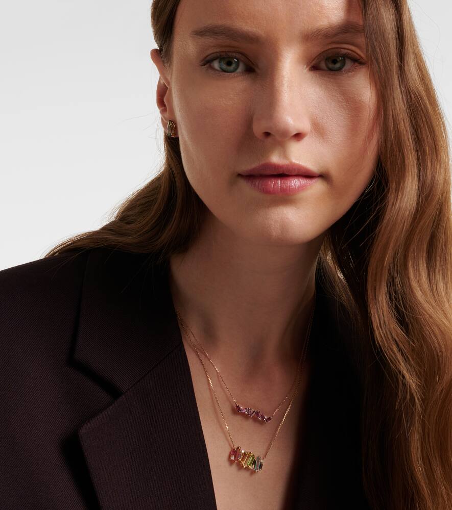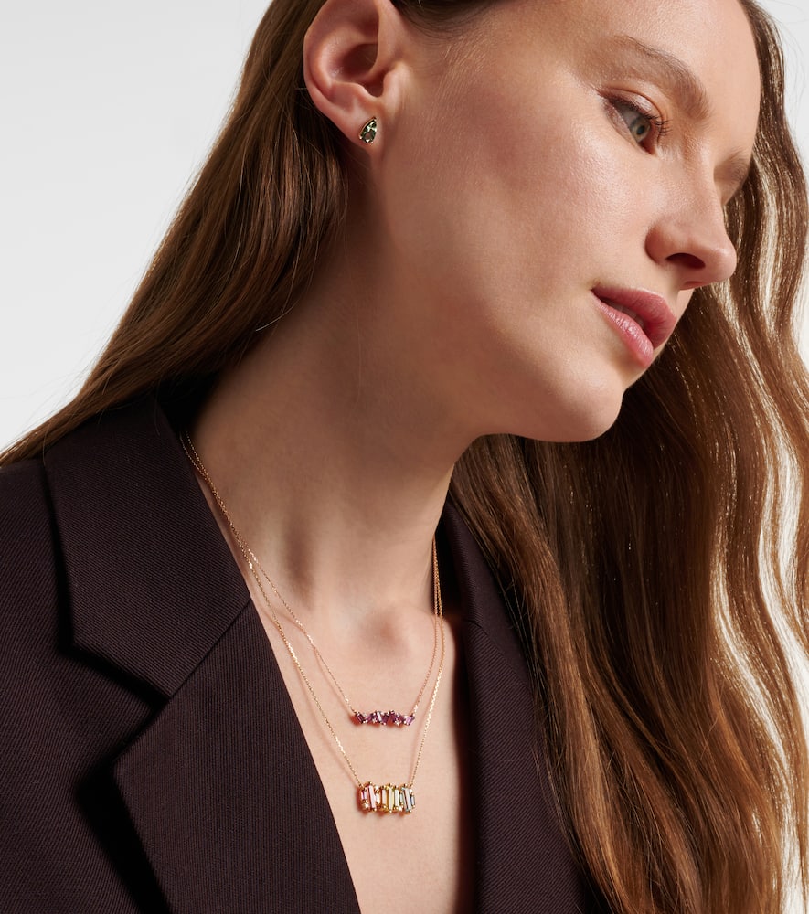 This Frenesia Bar 14kt gold necklace with rhodolite and diamonds by Suzanne Kalan is a beautiful and artistic piece that adds a touch of playful luxury to your jewelry collection. Handmade in the USA from 14kt yellow gold, this necklace features a horizontal bar adorned with brilliant rhodolite and 0.05 carats of white diamonds. The dynamic arrangement of the stones creates a modern and glamorous aesthetic. It's perfect for adding a unique touch of color and sparkle to your neckline.