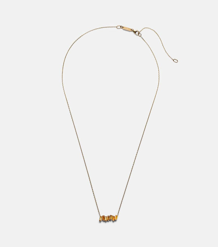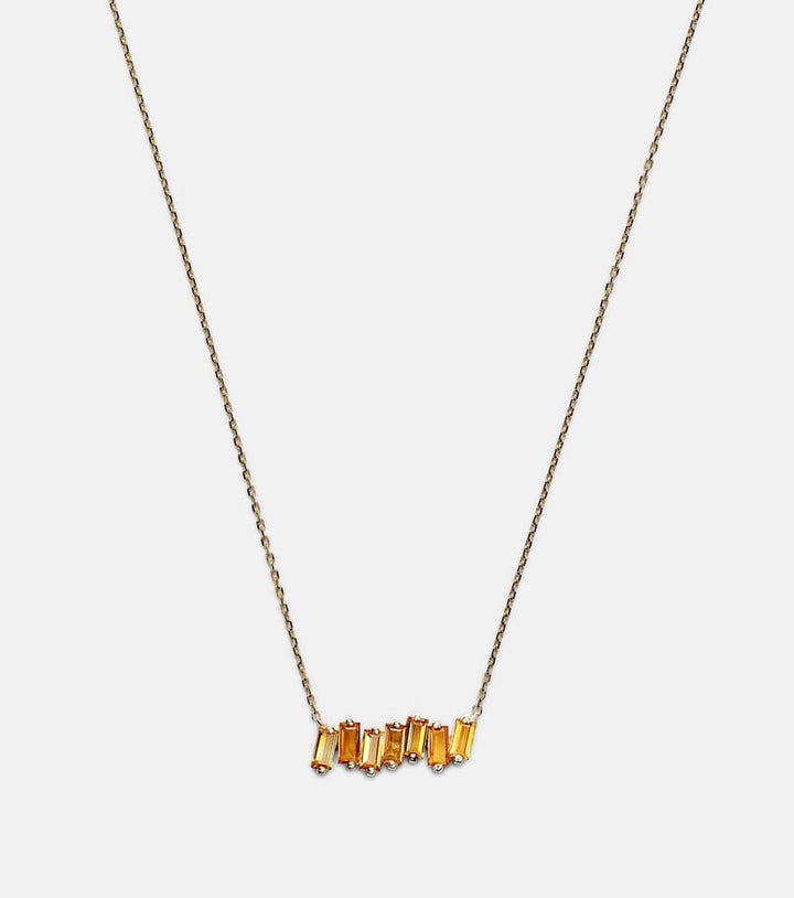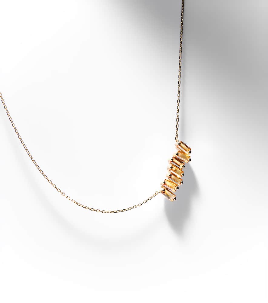 This necklace is handmade in the USA from 14kt yellow gold with a lobster-clasp fastening. It features baguette-cut citrines in a prong setting.