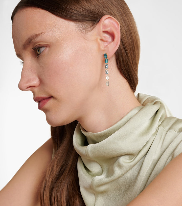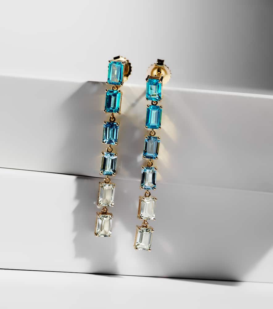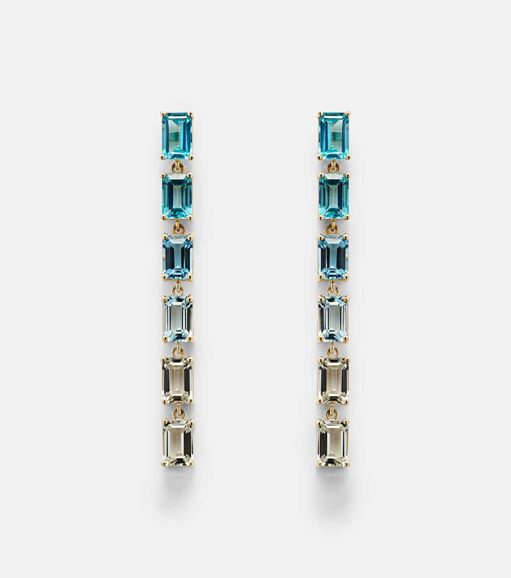 These Dawn 14kt yellow gold earrings with topaz by Suzanne Kalan are a stunning and modern statement, perfect for adding a touch of brilliant color to your look. Handcrafted in the USA from 14kt yellow gold, these earrings feature a beautiful arrangement of emerald-cut topazes in a prong setting. The design creates a captivating and luxurious aesthetic. These earrings are a celebration of vibrant color and refined craftsmanship.