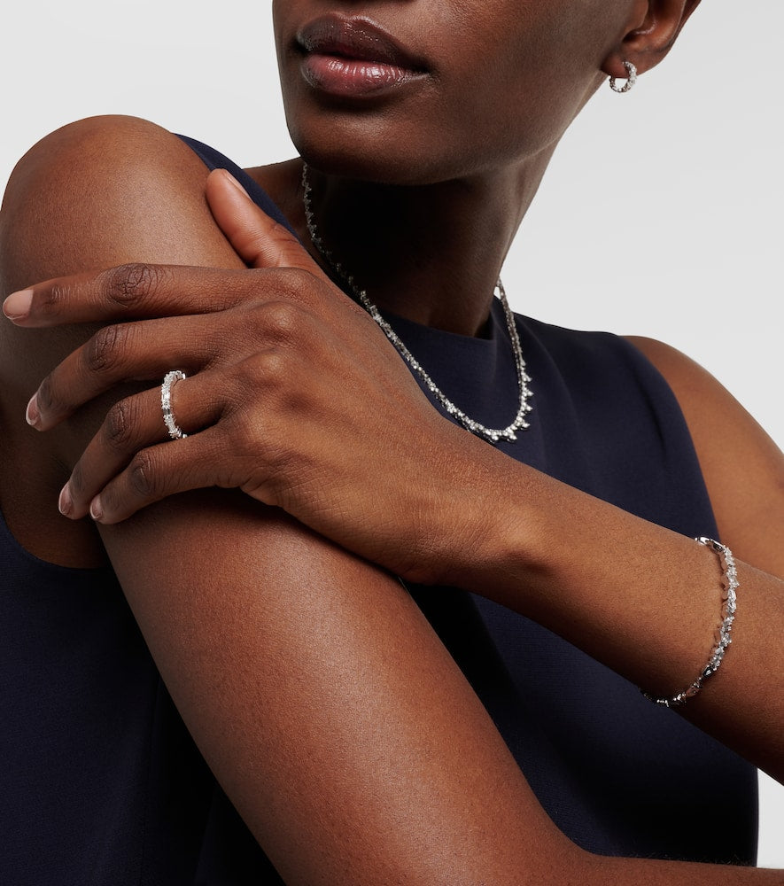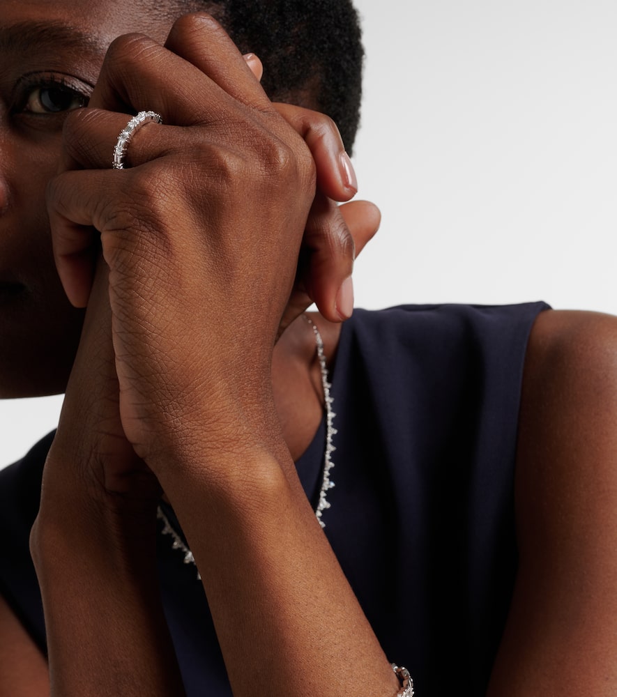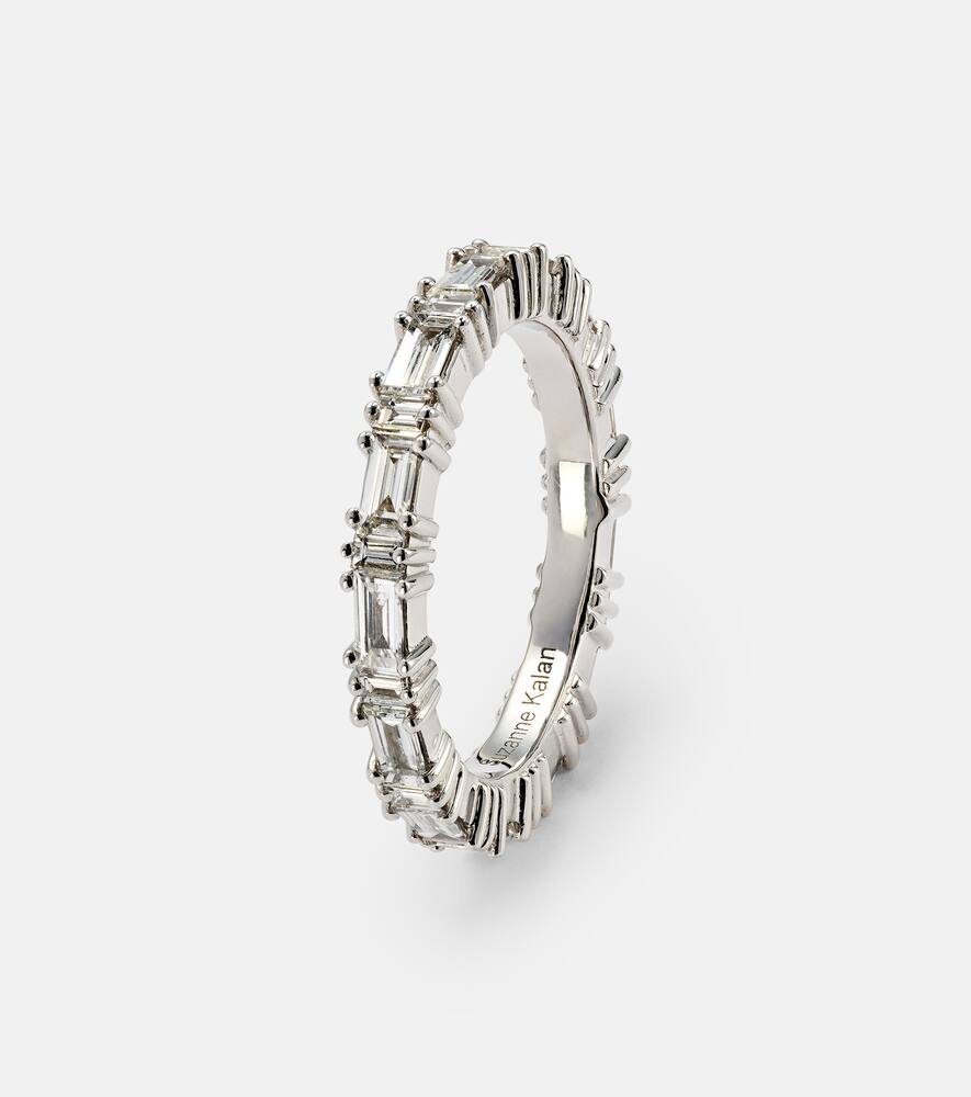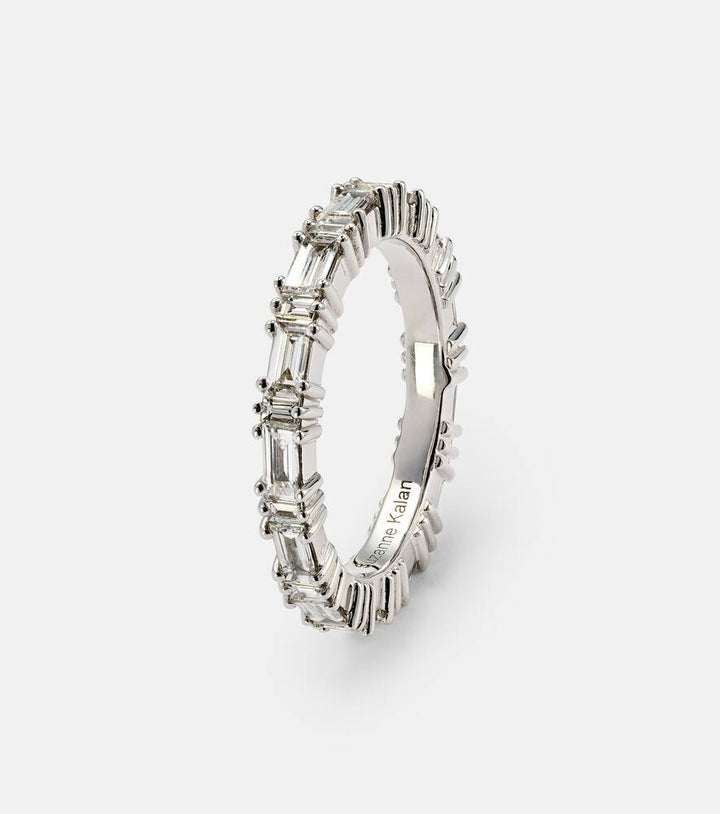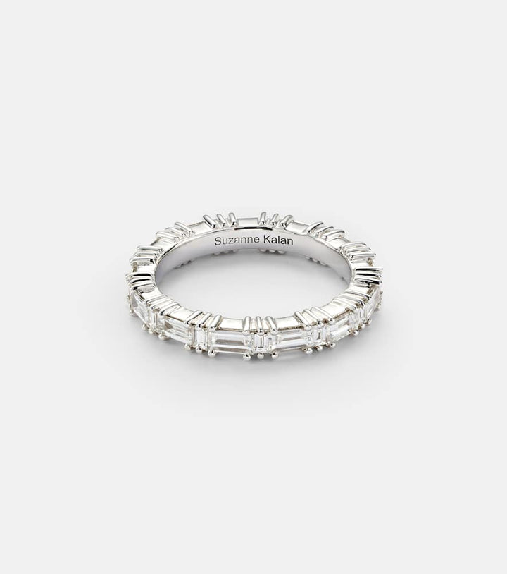 This 18kt white gold ring with diamonds by Suzanne Kalan is a sleek and modern masterpiece, designed to add a touch of brilliant sparkle to your jewelry collection. Handmade in the USA from 18kt white gold, this ring is adorned with 1.37 carats of baguette-cut white diamonds in a prong setting. The dynamic arrangement of stones creates a unique and sophisticated look, symbolizing modern elegance and artistry.