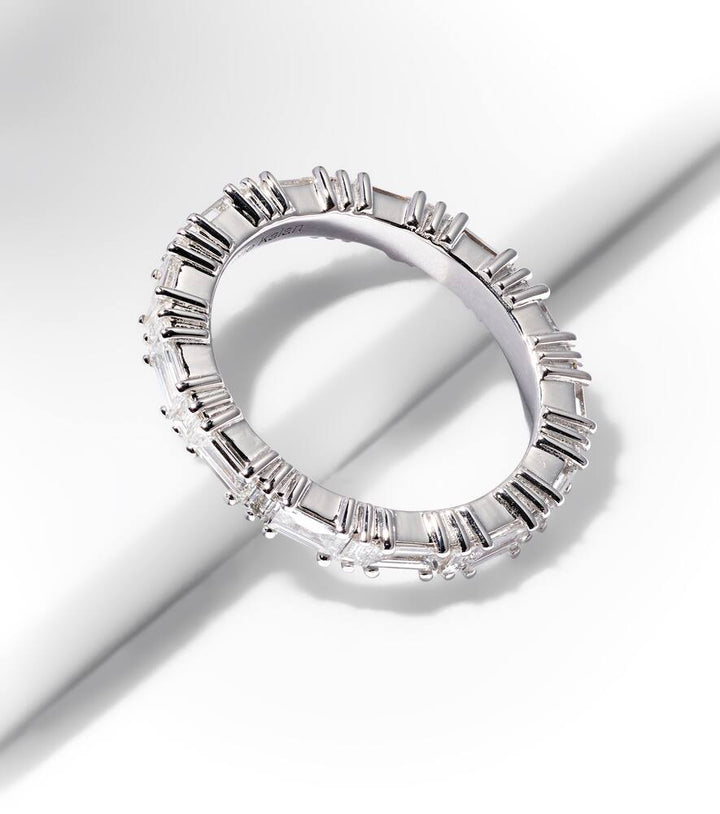 This ring is handmade in the USA from 18kt white gold and features 1.37 carats of baguette-cut diamonds in a prong setting.