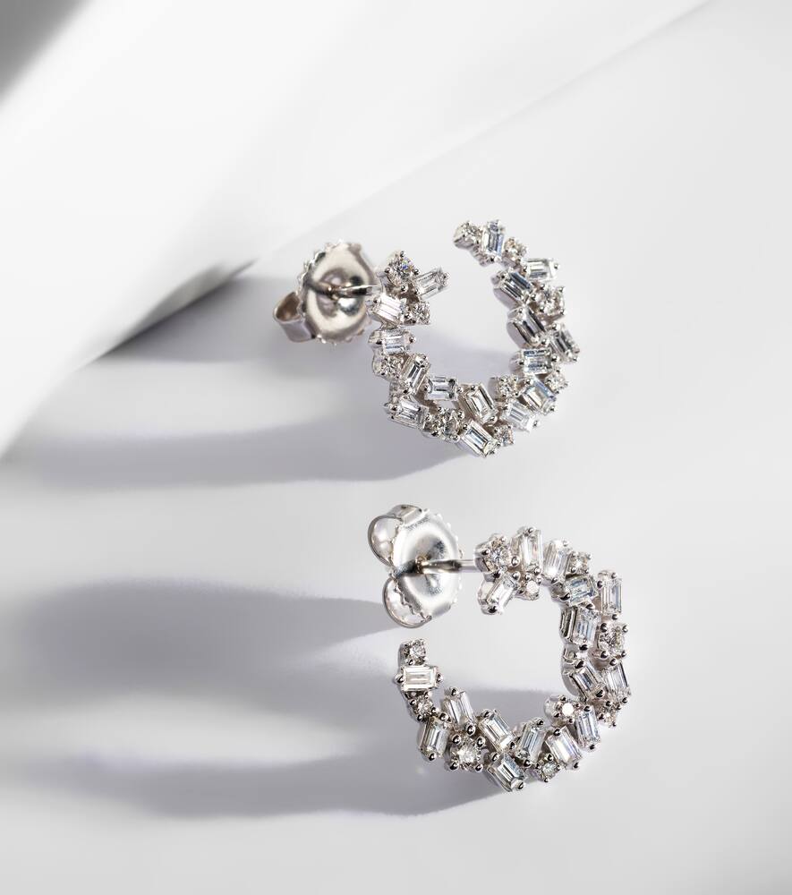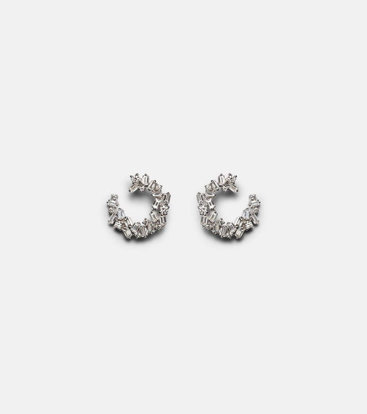 These Chloé 18kt white gold hoop earrings with diamonds by Suzanne Kalan are a dazzling and elegant statement piece. Handmade in the USA from 18kt white gold, these hoops are adorned with a dynamic mix of baguette-cut and round-cut white diamonds. The unique "Fireworks" setting creates a stunning, light-catching effect that is both sophisticated and modern. These earrings are a timeless symbol of luxury and brilliant craftsmanship.