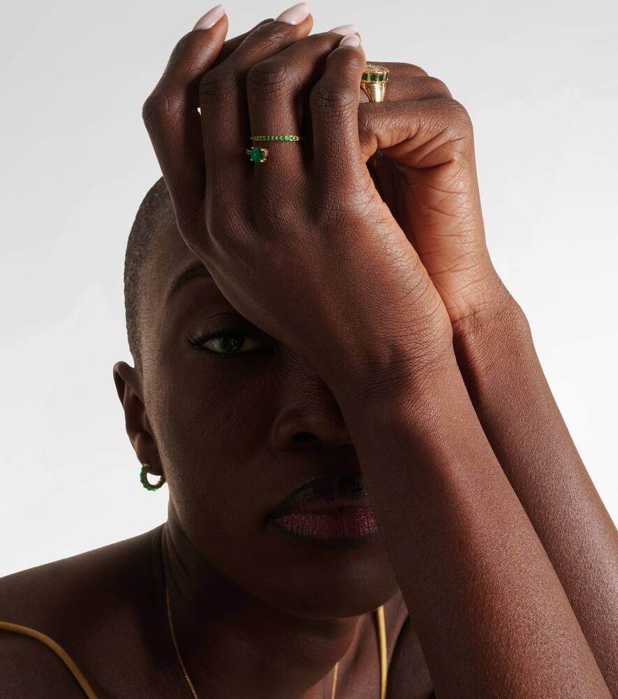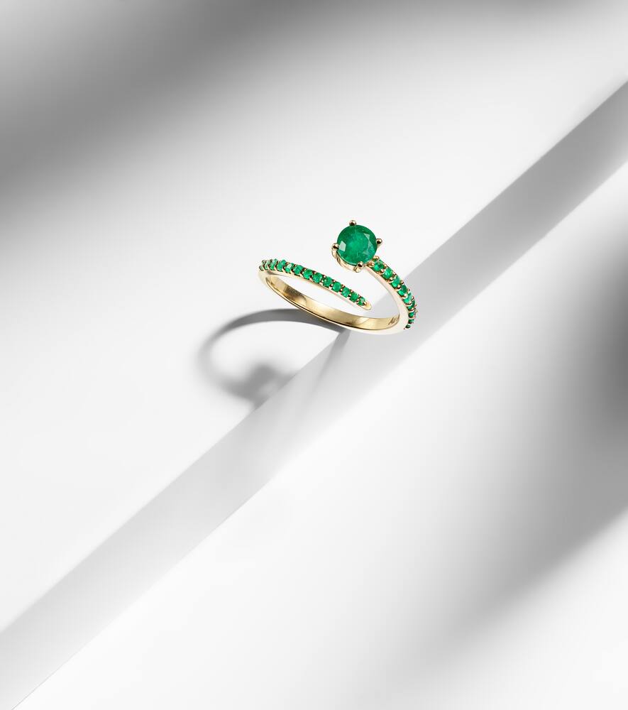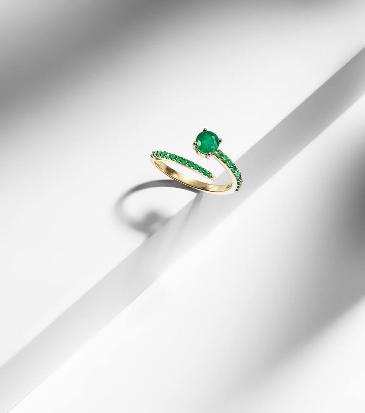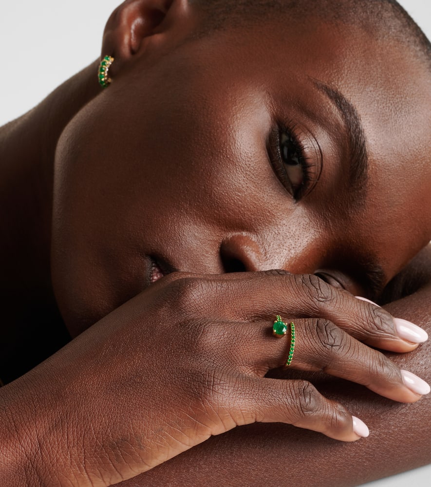 This Grass Seed 18kt yellow gold ring with emeralds by Ileana Makri is a unique and luxurious statement piece, designed to make every day special. Made in Greece from 18kt yellow gold, this ring is molded to snake elegantly around the finger, with a beautiful arrangement of 0.84 carats of round-cut emeralds that are carefully secured by prongs. The design evokes a sense of natural beauty and effortless elegance, perfect for adding a vibrant touch to your jewelry collection. It’s a bold and artistic piece that symbolizes a fresh approach to fine jewelry.