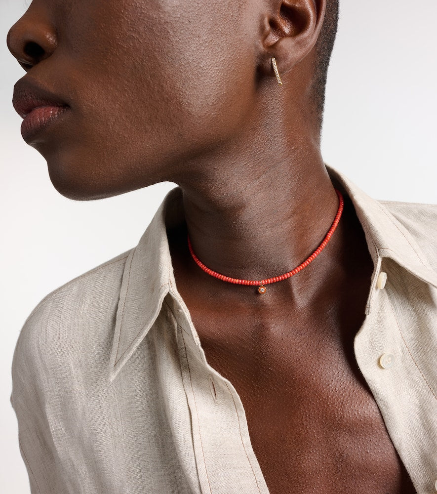 This Bamboo coral and 14kt gold charm necklace by Sydney Evan is a vibrant and natural statement. Made in Hong Kong, this necklace features a beautiful and delicate strand of bamboo coral beads adorned with a 14kt yellow gold charm. The design is a celebration of natural beauty and effortless luxury. This piece is a perfect addition for adding a touch of bohemian elegance and romantic charm to your look. It's a cherished staple that you will love for years to come.