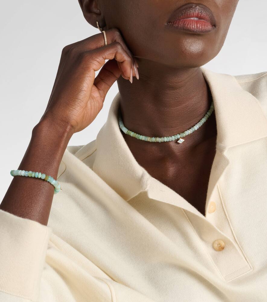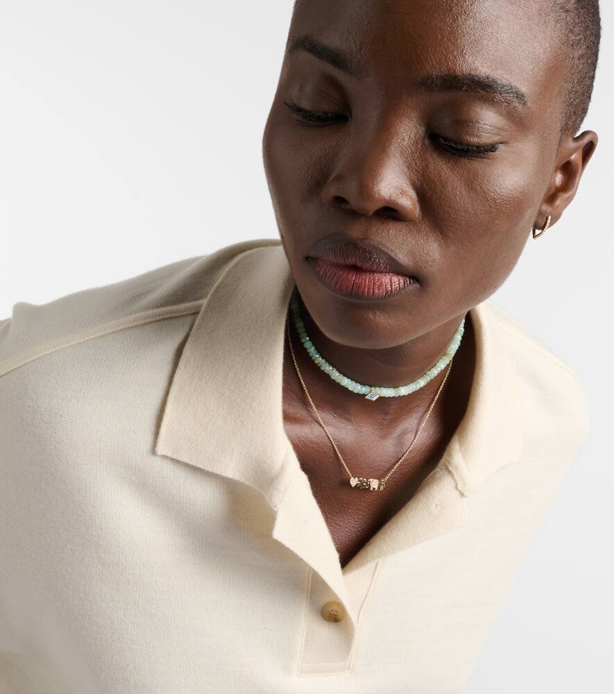 This Tiny Groovy Eye 14kt gold beaded choker with diamond by Sydney Evan is a mystical and bohemian statement piece, drawing on a classic talismanic motif. Made in Hong Kong from 14kt yellow gold, this adjustable choker features a strand of beads adorned with a tiny groovy eye charm with a diamond. The design is a celebration of natural beauty and effortless luxury, symbolizing a fresh and modern approach to fine jewelry.