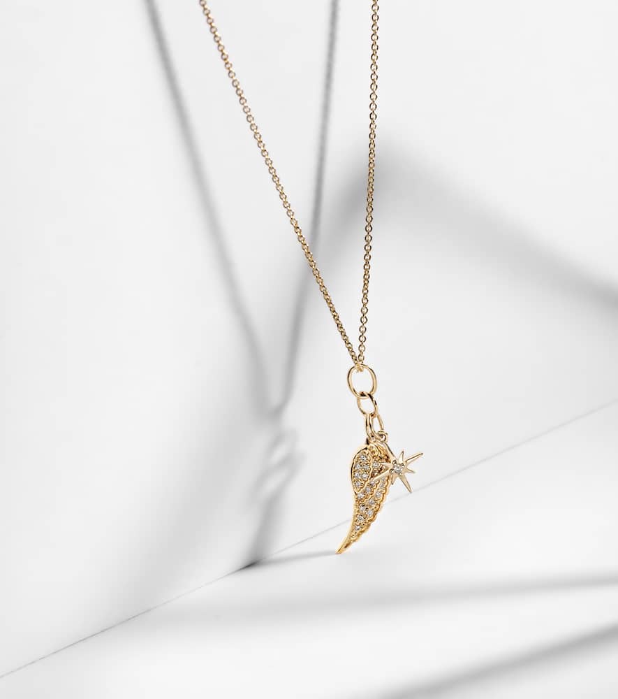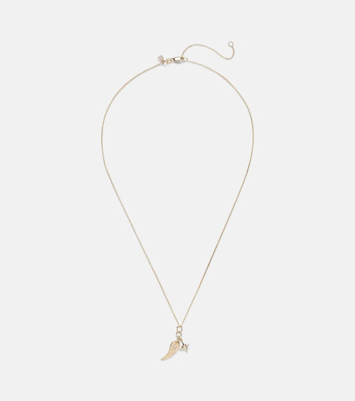 This Wing and Starburst 14kt gold necklace with diamonds by Sydney Evan is a celestial and enchanting statement. Made in Hong Kong from 14kt yellow gold, this necklace features a wing and starburst charm adorned with brilliant diamonds. The design is a celebration of magical, whimsical style and is a symbol of hope and aspiration. This piece is a perfect addition for adding a touch of romantic charm to your daily look.