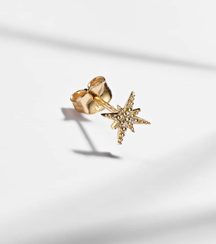 These stud earrings are made in Hong Kong from 14kt yellow gold and feature white diamonds. They have a butterfly-back fastening and a length and max width of 5mm (0.2").