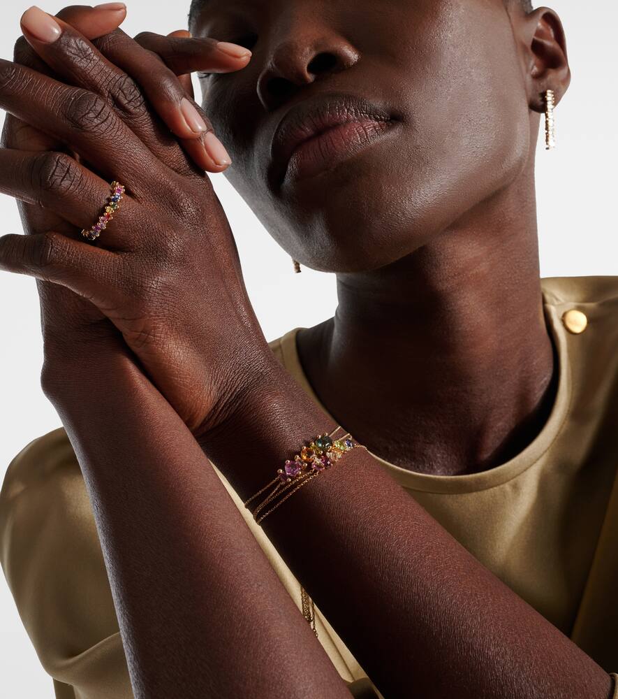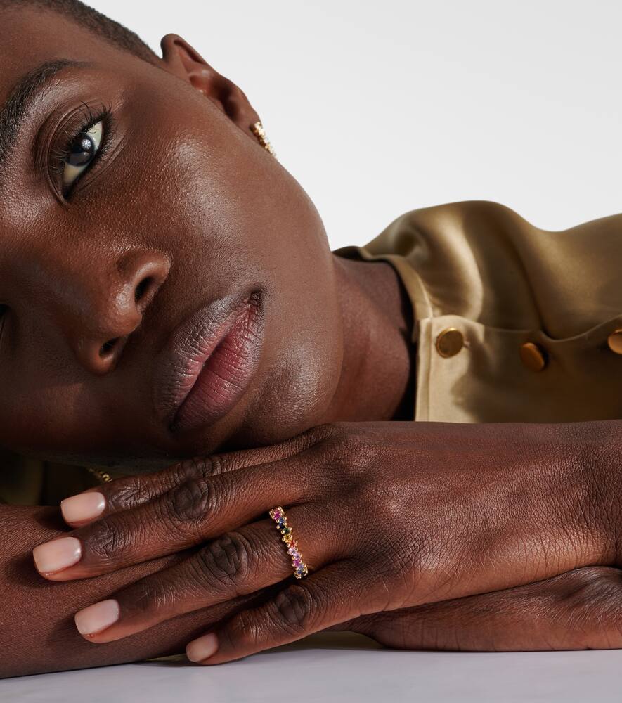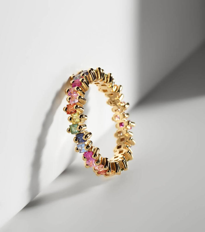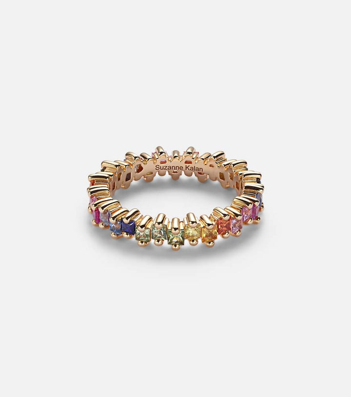 This Rainbow 18kt gold ring with sapphires by Suzanne Kalan is a vibrant and enchanting statement, perfect for adding a joyful pop of color to your jewelry collection. Handmade in the USA from 18kt yellow gold, this slim-profiled ring is beautifully encrusted with colorful princess-cut sapphires in the brand's signature off-kilter formation. This piece is a celebration of confident style and is perfect for adding a touch of high-octane sparkle. It is an investment-worthy piece that you will love for years to come.