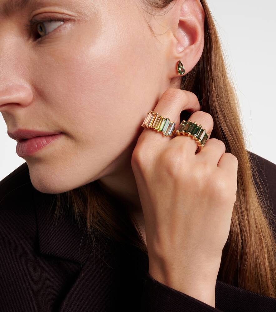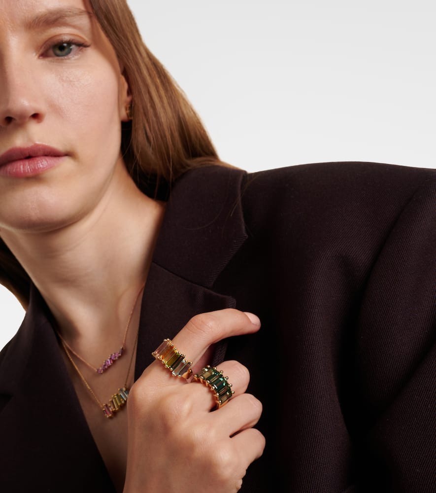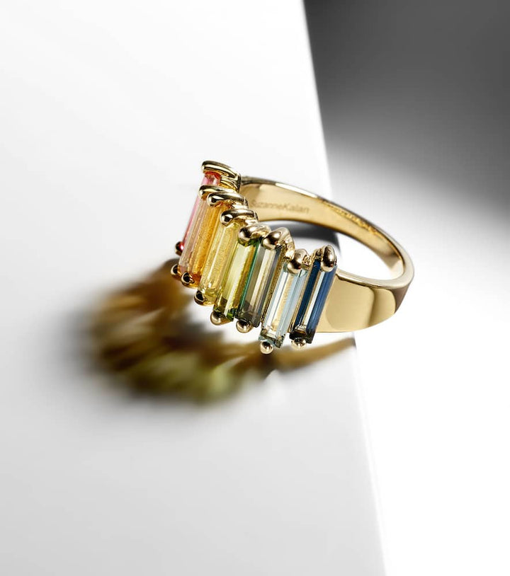 This Suzanne Kalan Rainbow 14kt gold ring with topazes by Suzanne Kalan is a vibrant celebration of color and joy. Featuring a mix of baguette-cut topaz stones in rainbow hues, it evokes optimism and playfulness, perfect for marking life’s special moments. The 12mm band provides a bold yet elegant presence, ideal for wearing alone or alongside complementary pieces to create a layered effect.