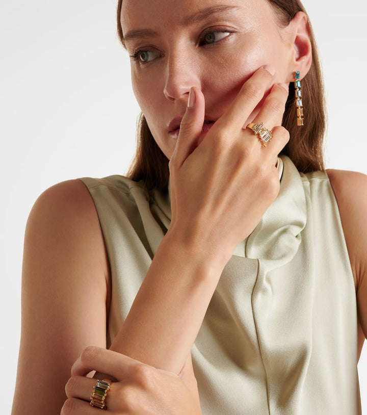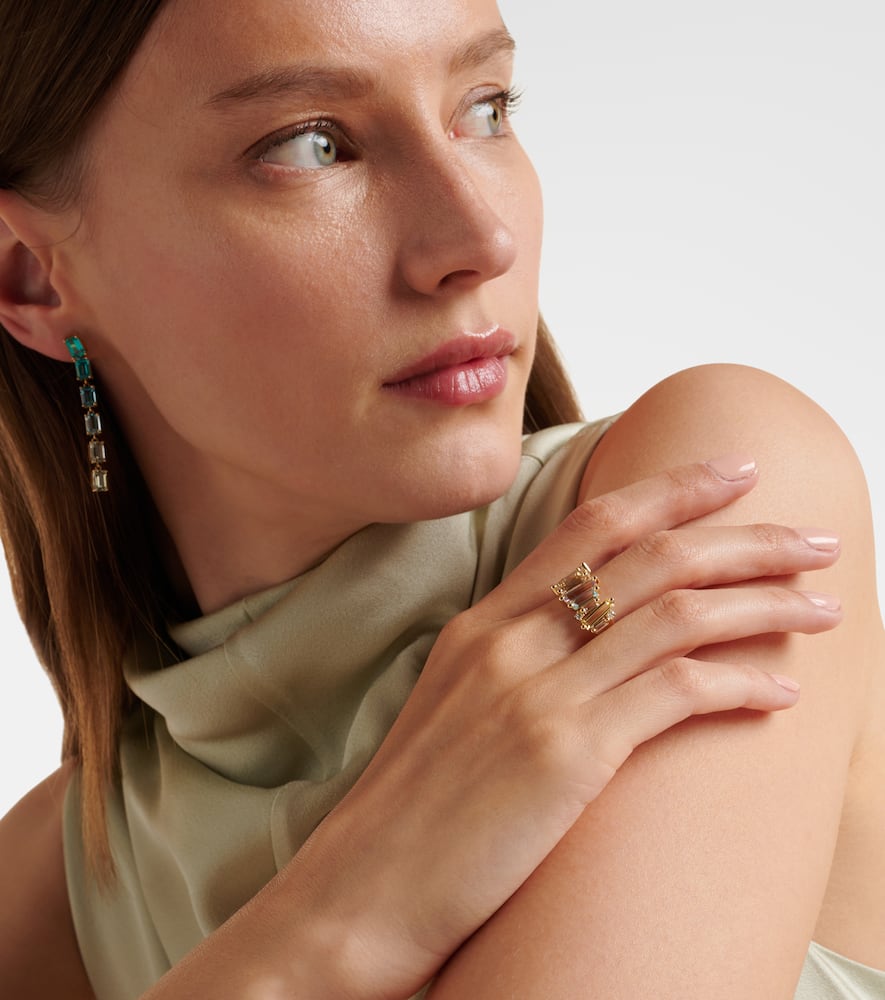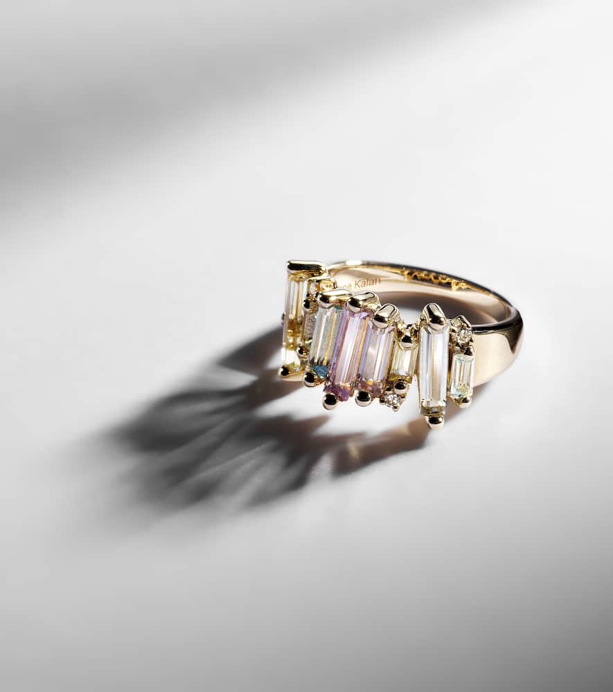 This Suzanne Kalan Pastel Rainbow 14kt gold ring with diamonds by Suzanne Kalan blends soft, delicate colors with a signature off-kilter formation of baguette-cut stones. Embellished with 0.1ct round-cut white diamonds, the ring conveys harmony and understated joy. Its 11mm width allows it to serve as a statement piece while remaining versatile enough for stacking or pairing with other pastel-hued jewelry.