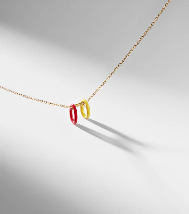 This Persée 18kt gold necklace with enamel by Persée combines sophisticated simplicity with playful color. Crafted from 18kt gold-plated brass in Belgium, it features yellow and pink enamel detailing, offering a charming and versatile accessory. Adjustable length ensures a comfortable fit.