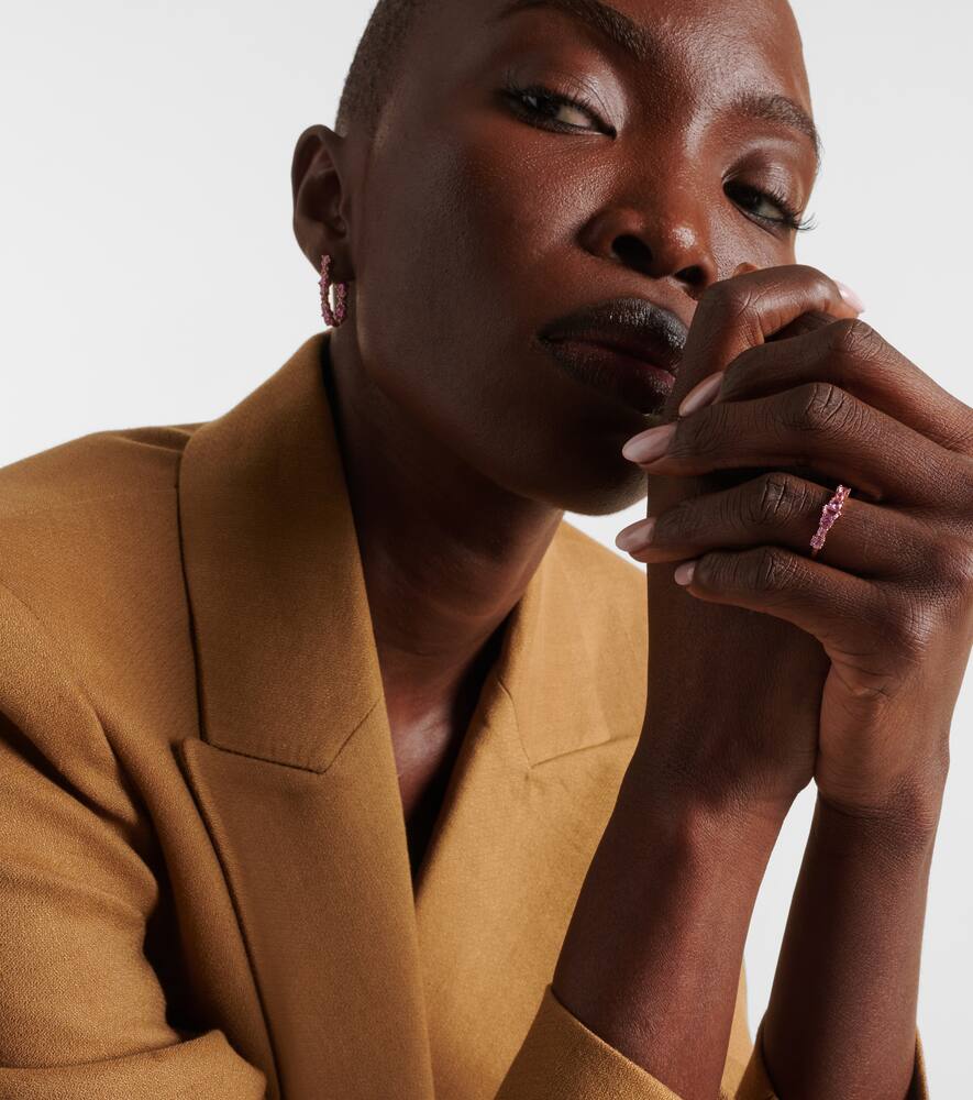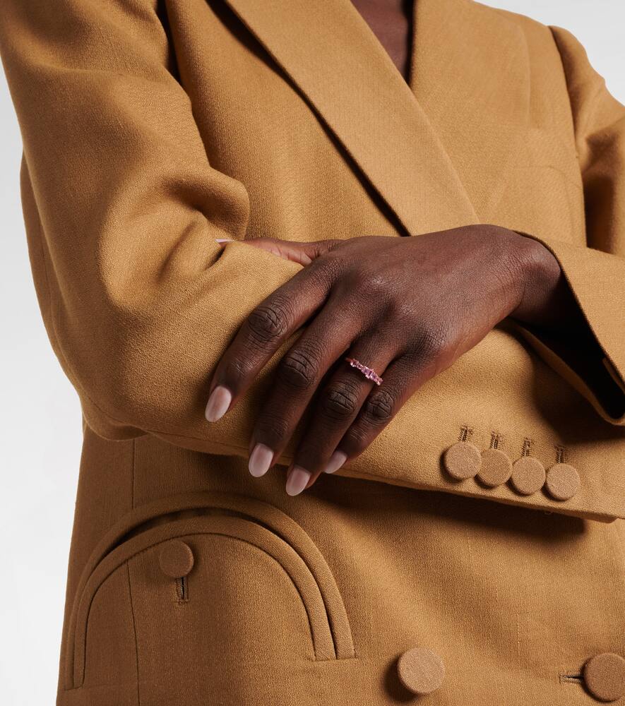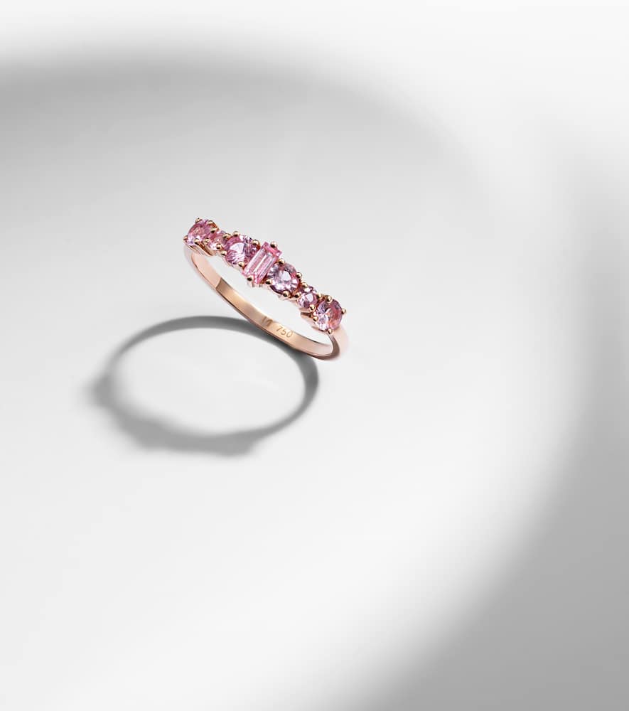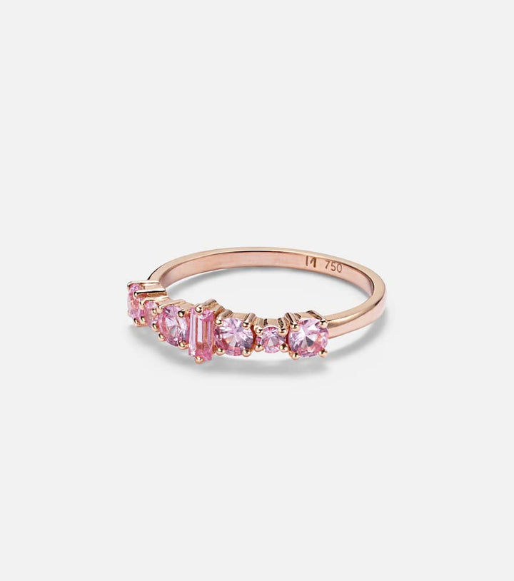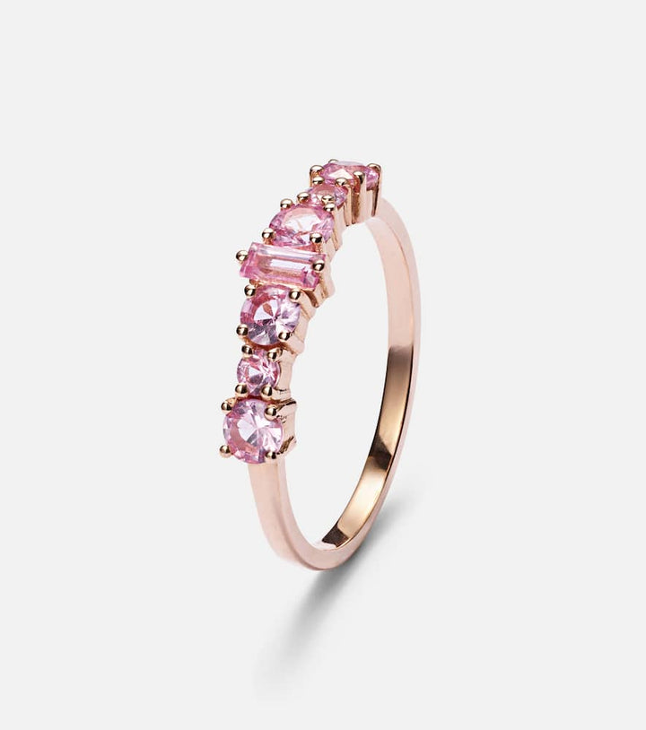 This Ileana Makri Rivulet 18kt rose gold ring with sapphires by Ileana Makri is a delicate and elegant everyday piece. Crafted in 18kt rose gold, it is adorned with round- and baguette-cut pink sapphires in a prong setting, offering subtle sparkle and sophistication.