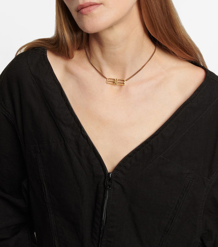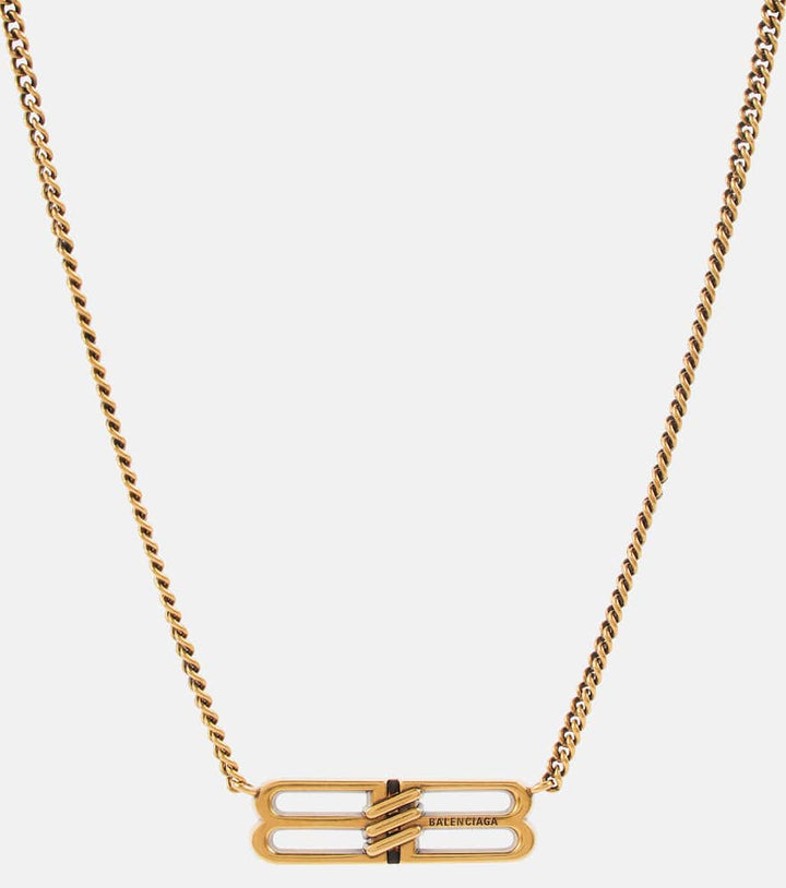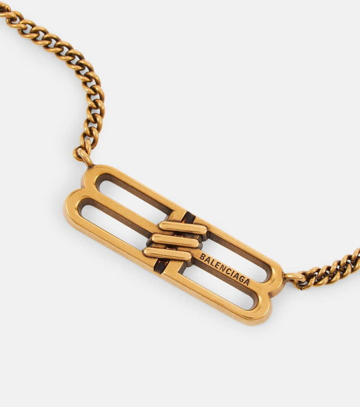 This Balenciaga BB Icon necklace by Balenciaga is a minimalist yet iconic statement. Crafted in brass with an antique gold finish, the necklace features the BB logo pendant and a lobster-clasp fastening, offering versatile and stylish wear.