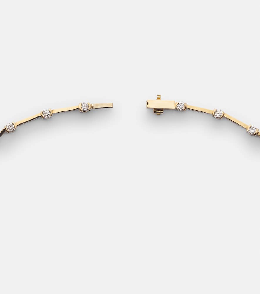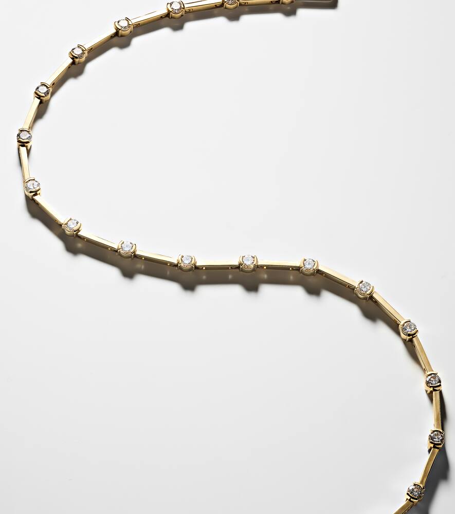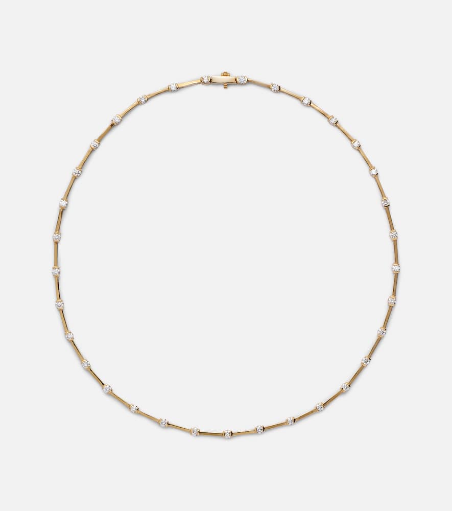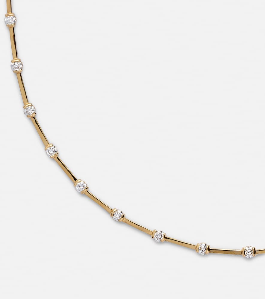 Handcrafted in 18kt yellow gold, set with 3.47ctw round-cut diamonds in prong setting. Length 40.6cm-16", max width 3mm-0.1". Made in the USA.
