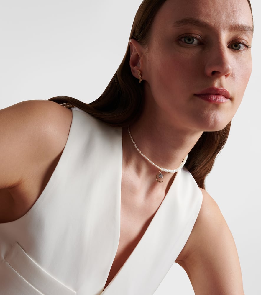 This Half Moon Choker by Sydney Evan is a modern expression of celestial elegance. The sleek 14kt gold band is adorned with a mother-of-pearl inlay and subtle diamond accents, evoking a sense of lunar-inspired mystery and delicate sophistication. Adjustable and versatile, it can complement both casual and formal looks, adding a touch of luminous refinement to any ensemble.