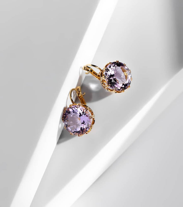These Amethyst Earrings by Ileana Makri are radiant, round-cut stones set in 18kt yellow gold. Their vibrant purple hue exudes elegance and sophistication, perfect for day or evening wear.