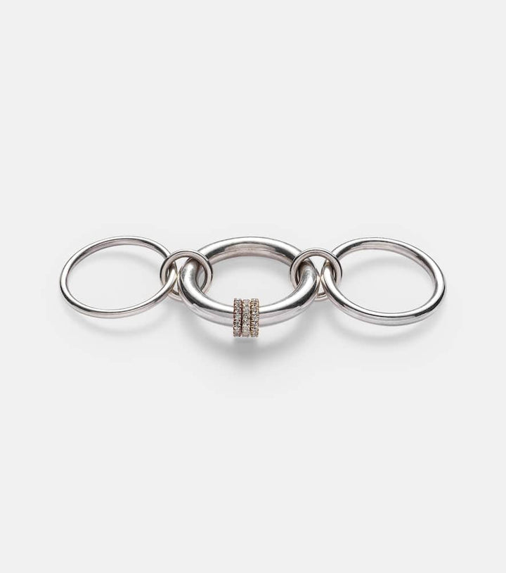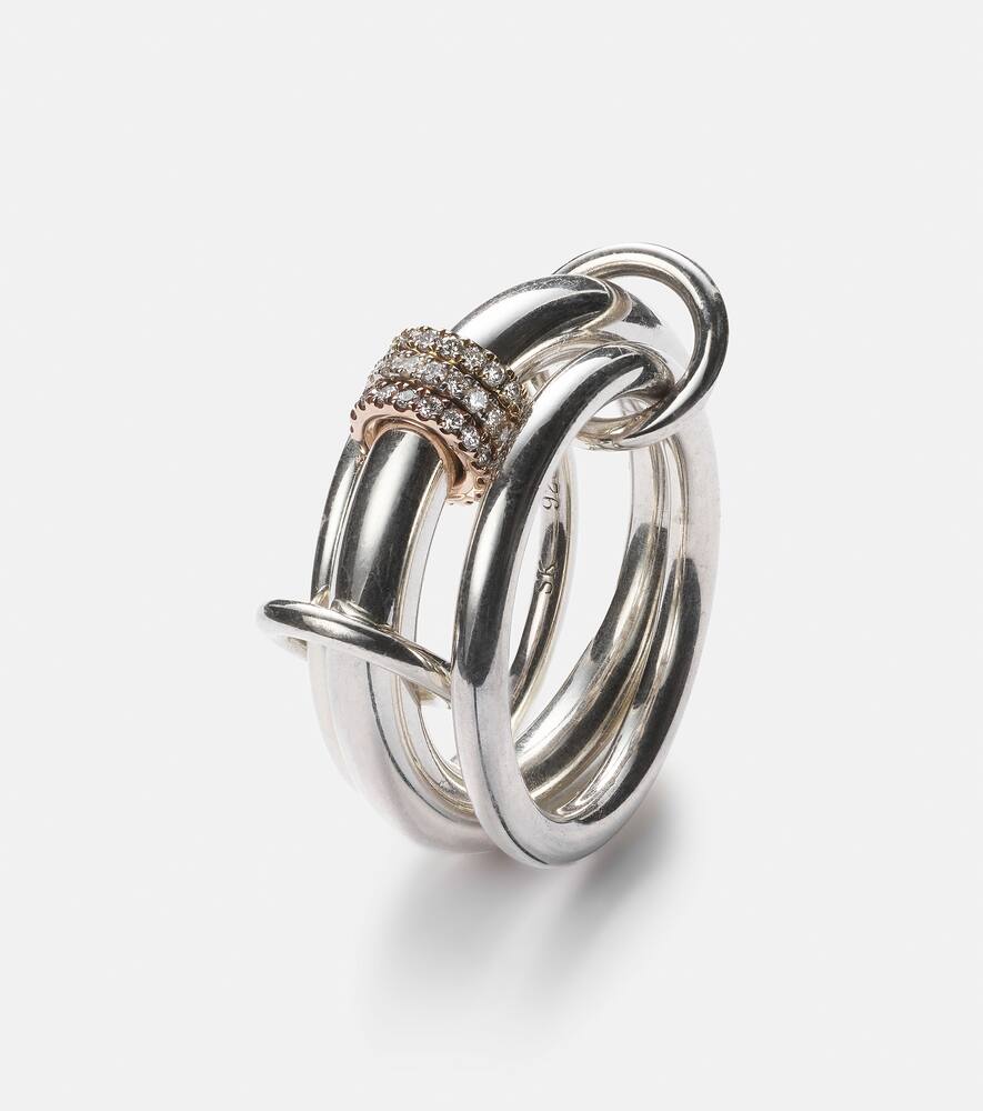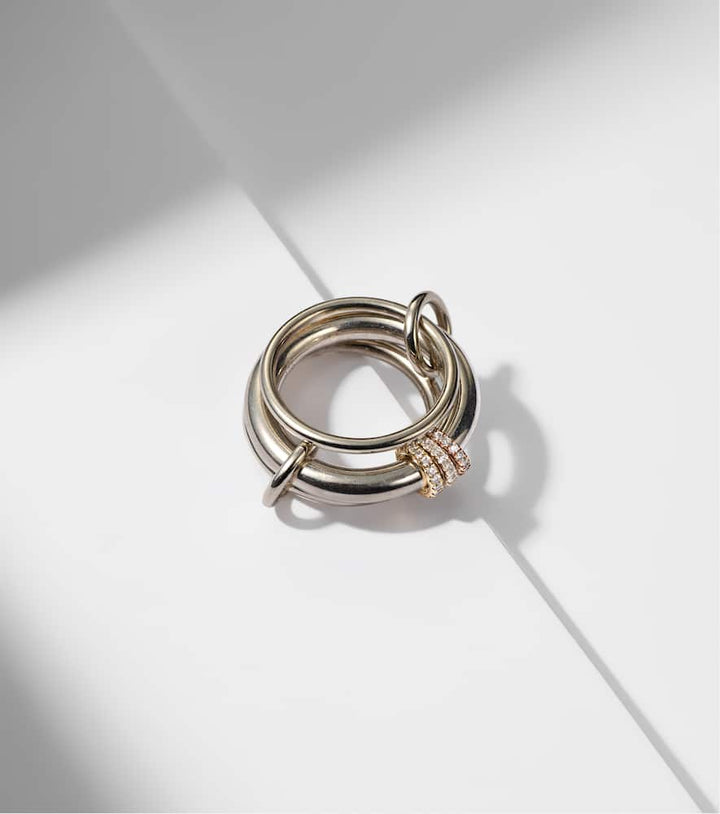 This Gemini Ring by Spinelli Kilcollin merges sterling silver with 18kt yellow and rose gold accents. Three linked bands, including pavé-set diamonds, create a contemporary, architectural design that embodies versatility and modern luxury.