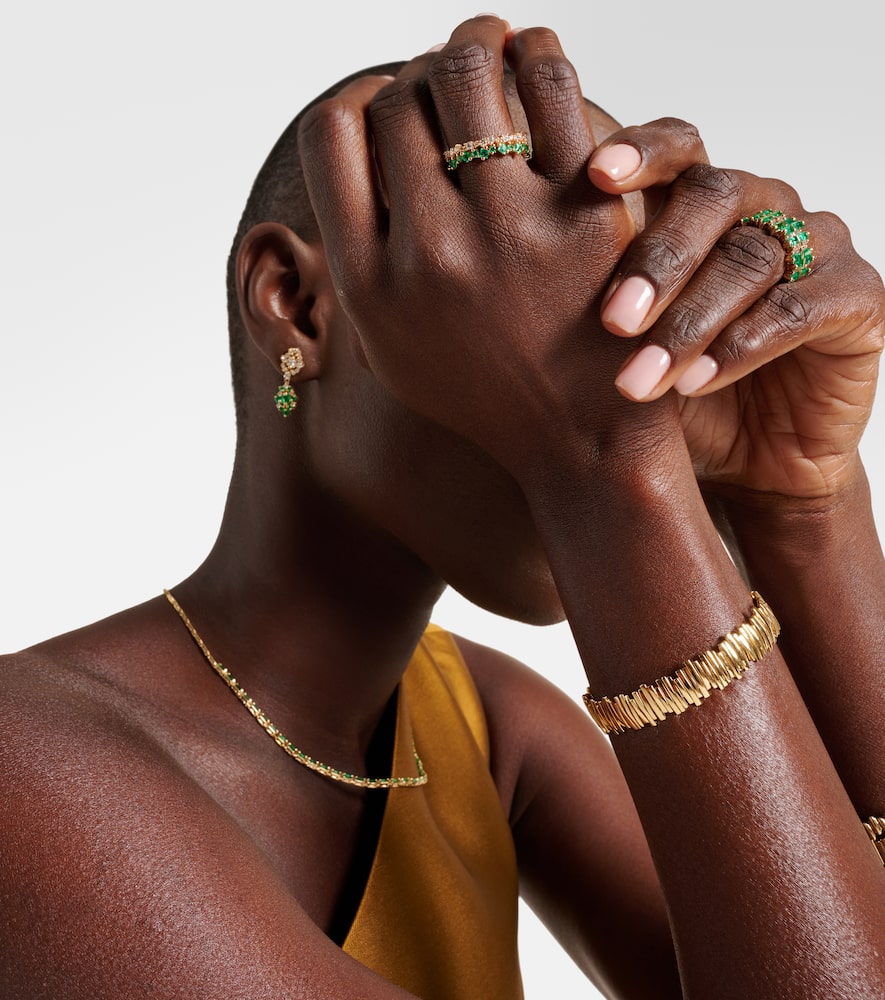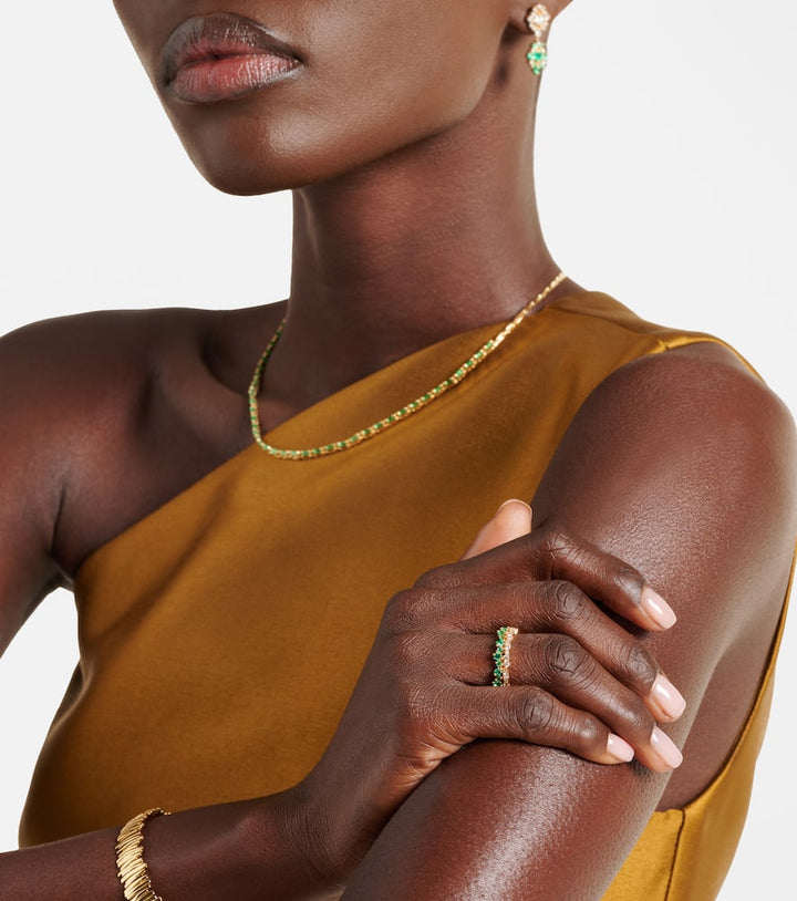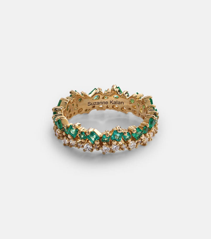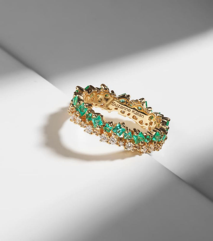 This Ring with Diamonds and Emeralds by Suzanne Kalan combines 14kt yellow gold with gleaming white diamonds and vibrant emeralds. A refined, luxurious piece, it adds a timeless yet contemporary touch to any jewelry edit.