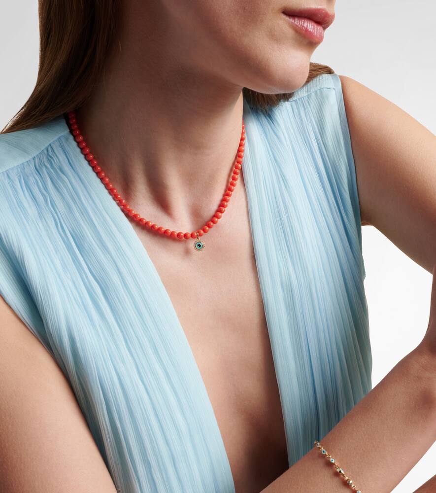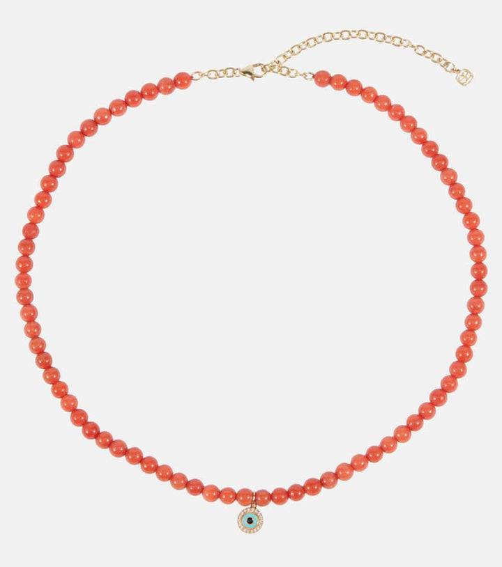 Evil Eye 14kt gold and coral beaded necklace with diamonds