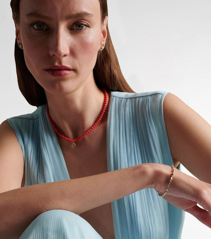 This Evil Eye Necklace by Sydney Evan combines protection symbolism with contemporary charm. Crafted in 14kt yellow gold, it features coral beads and 0.05ct diamonds, creating a playful yet meaningful piece that adds subtle luxury to any jewelry edit.