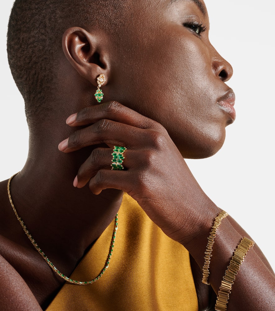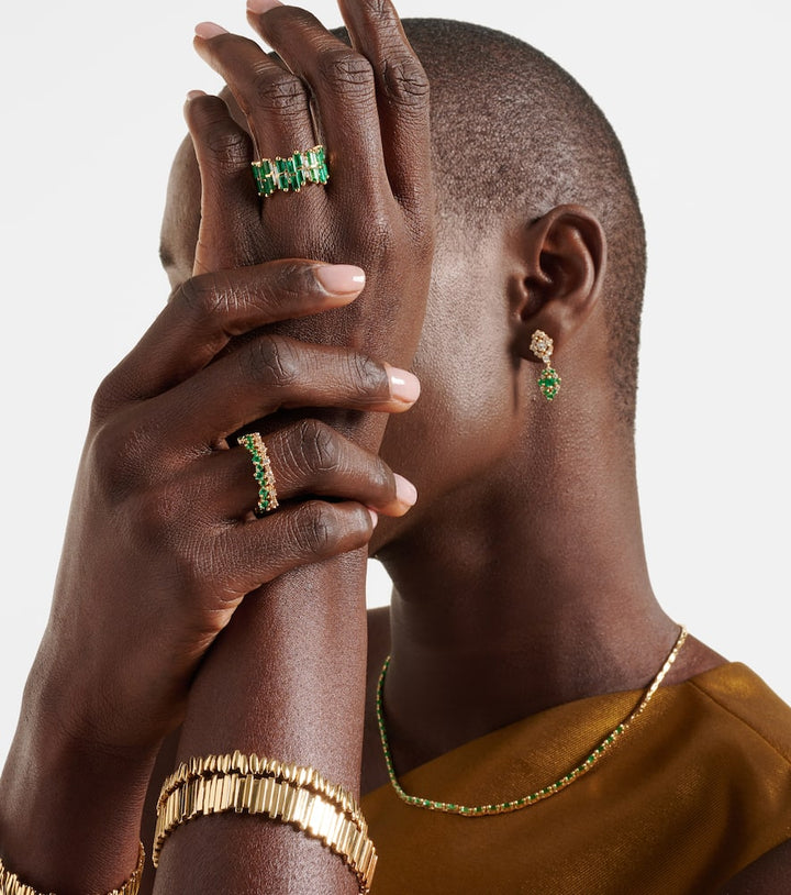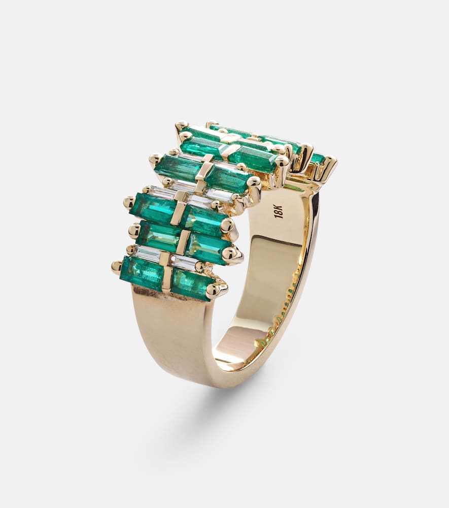This Emerald and Diamond Ring by Suzanne Kalan is a bold, asymmetrical statement. Crafted in 18kt yellow gold, it features 2.17ct baguette-cut emeralds scattered with 0.35ct diamonds for a dynamic, signature aesthetic.