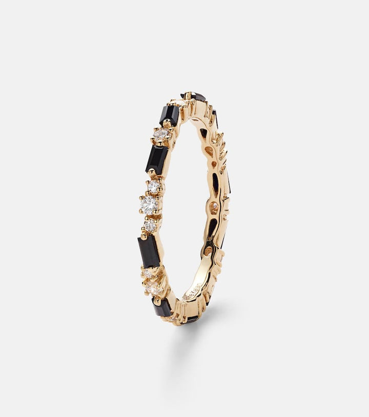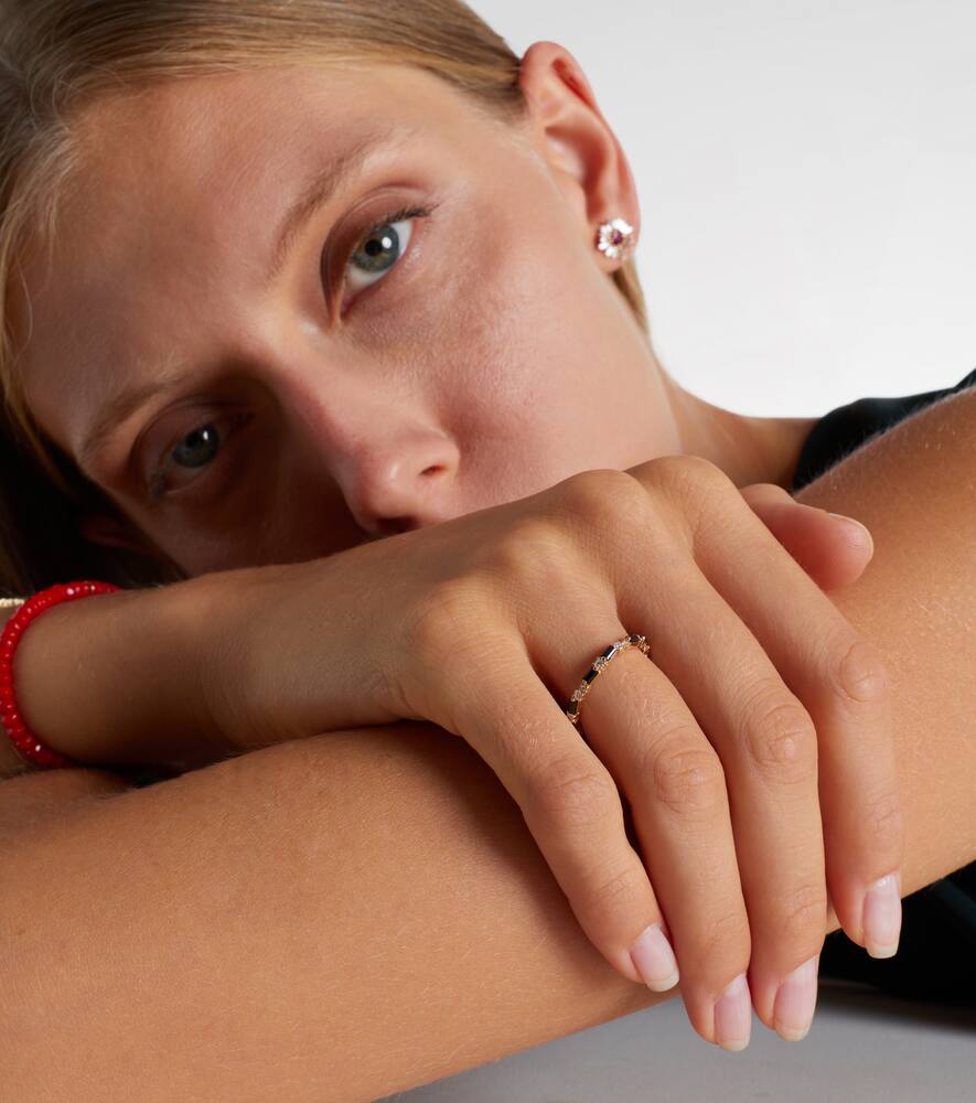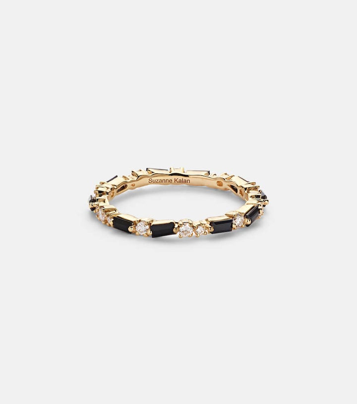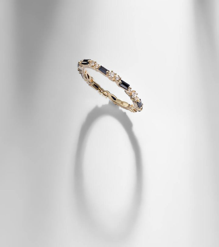 This Ring with Diamonds and Sapphires by Suzanne Kalan is a dainty, elegant take on the eternity band. Crafted in 18kt yellow gold, it features 0.30ct round-cut diamonds and 0.80ct baguette-cut sapphires, creating a unique, versatile addition to any jewelry collection.