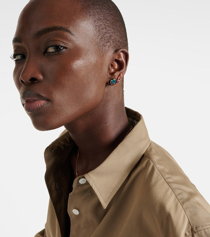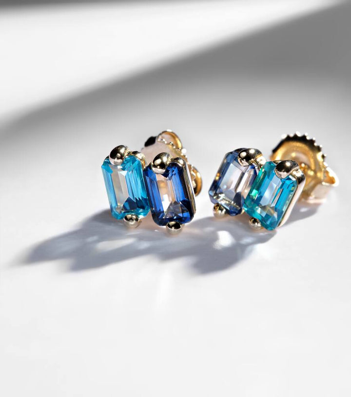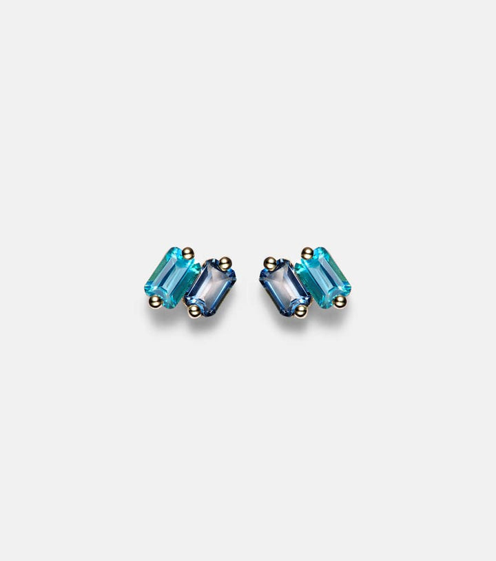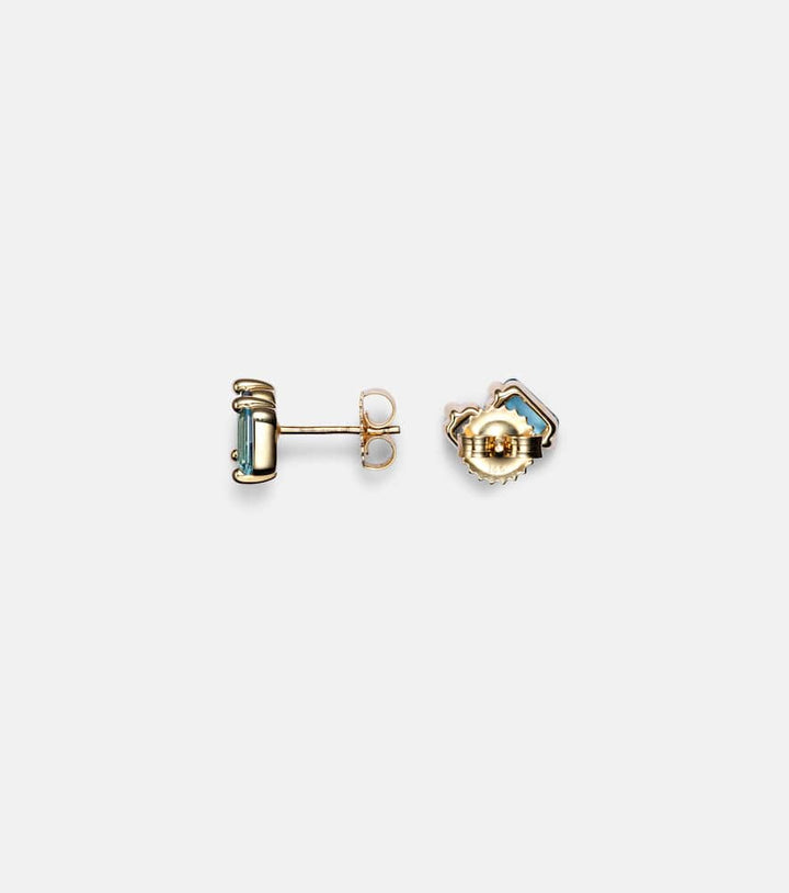 Handcrafted in 14kt yellow gold with topaz, made in the USA. Length 8mm, width 8mm. Butterfly-back fastening. Designer color name: Bluemix/YG.