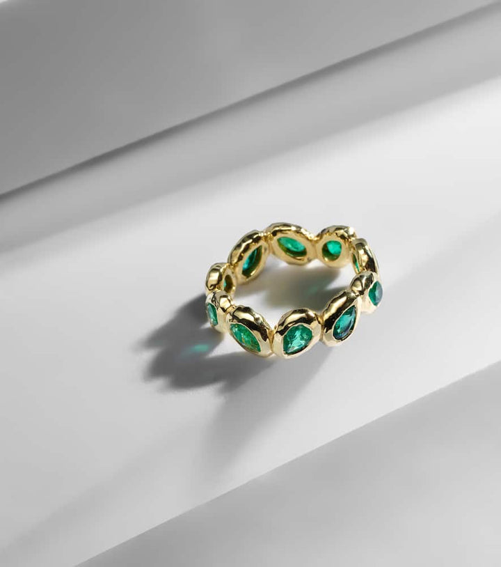This Nesting Gem 18kt gold eternity ring with emeralds by Octavia Elizabeth is a magnificent and opulent statement piece. Made in the USA from 18kt yellow gold, this eternity ring is a breathtaking masterpiece. It is defined by pear-shaped emeralds, a gemstone that symbolizes growth and abundance. The design is a celebration of a sophisticated and graceful style and is perfect for adding high-end sparkle to any ensemble. It can be worn on its own for a subtle statement or stacked with other rings for a bolder, more personalized style.
