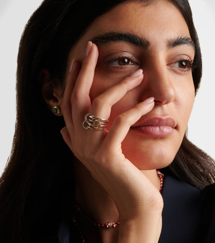 Spinelli Kilcollin is a luxury jewelry brand founded by designer Yves Spinelli and his wife, Dwyer Kilcollin, known for its innovative and contemporary designs. The brand’s signature style is the 'Galaxy Rings,' a series of interconnected, stackable bands that can be worn across multiple fingers or stacked on one. Crafted from a mix of gold, sterling silver, and diamonds, Spinelli Kilcollin's pieces blend minimalism with versatility. Their designs emphasize modern elegance and modularity, offering a bold yet refined aesthetic that appeals to those seeking unique, multifunctional jewelry.