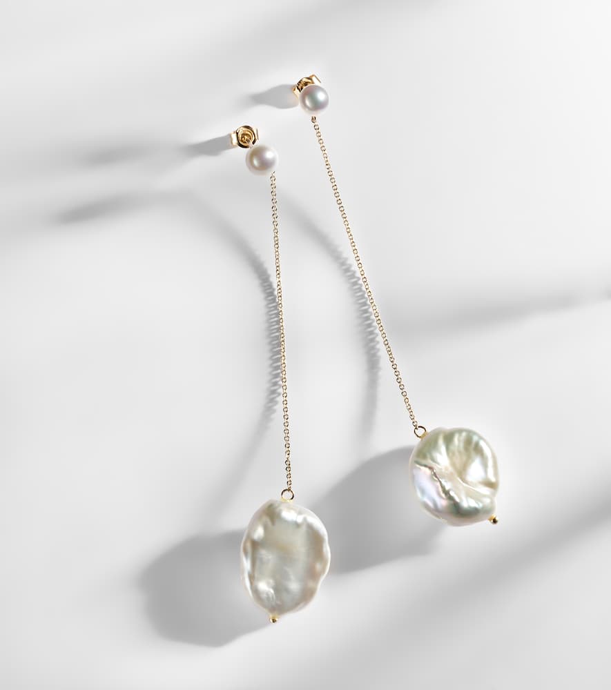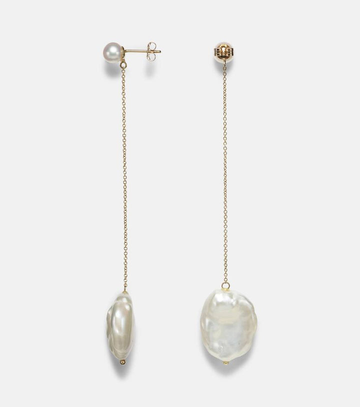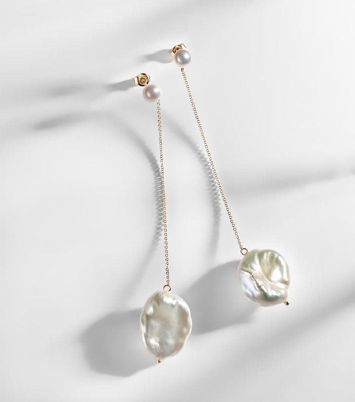 These 14kt gold drop earrings with pearls by Mateo are a modern and minimalist piece. Made in the USA from 14kt yellow gold, these earrings feature a sleek drop design with Baroque freshwater pearls. The design is a beautiful blend of a timeless aesthetic and modern luxury, perfect for adding a touch of refined style to your daily look. They are a versatile staple that you will love for years to come.