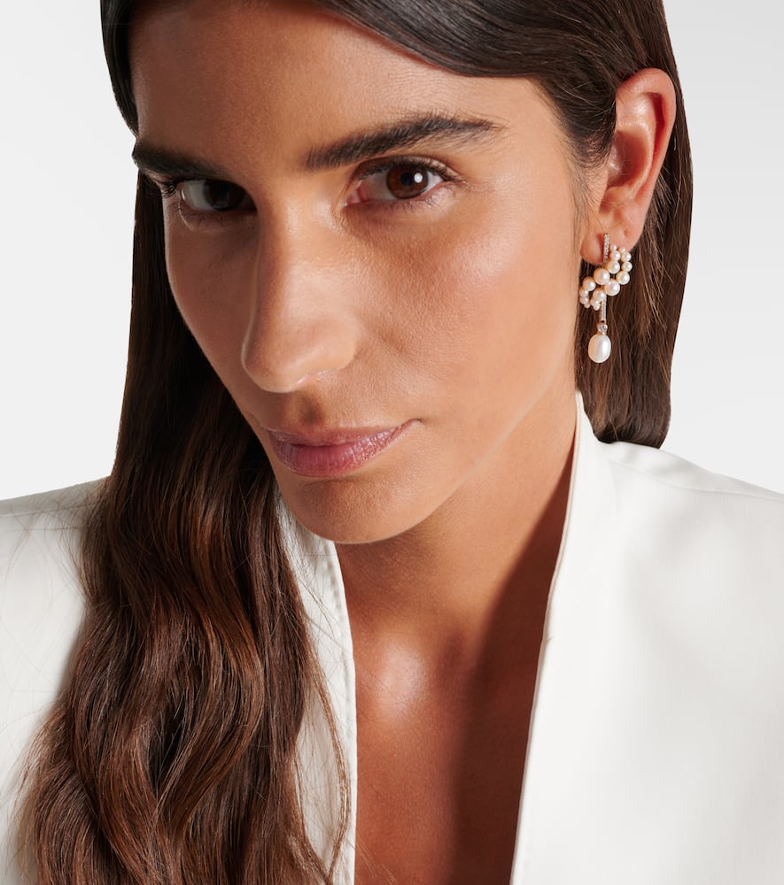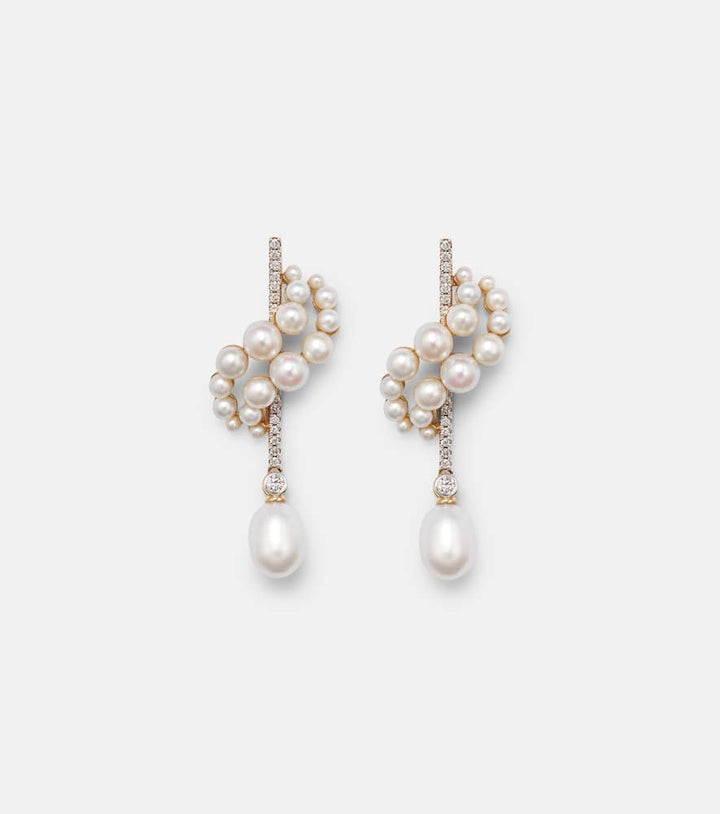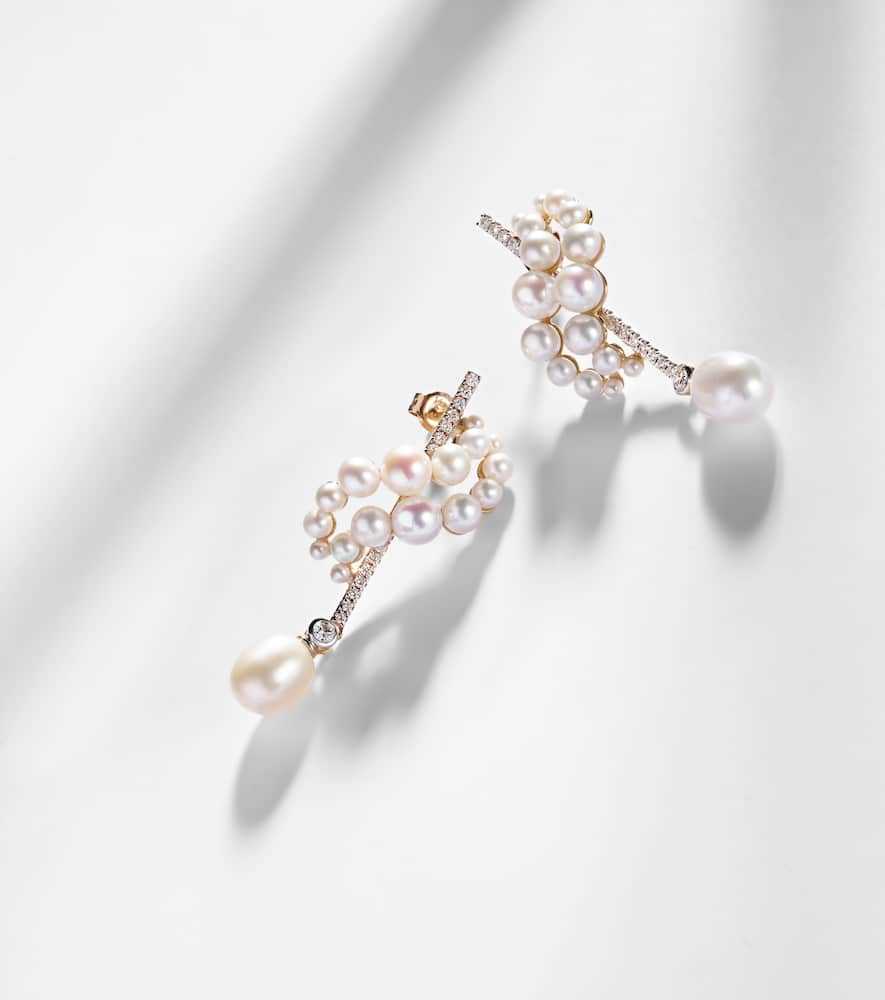 These earrings are made in the USA from 14kt yellow gold. They feature 0.36 carats of diamonds in a pavé and bezel setting, and freshwater pearls. They are for pierced ears.