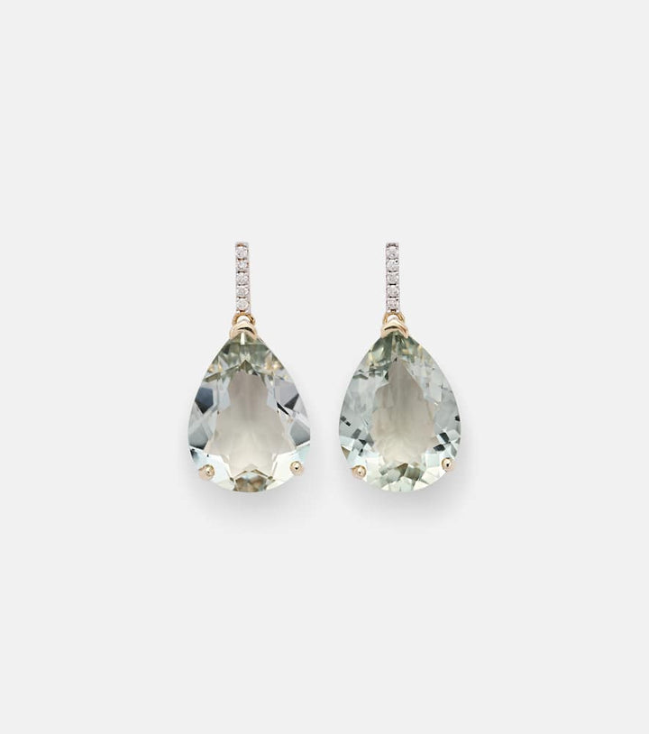 These earrings are made in the USA from 14kt yellow gold. They feature 24 carats of pear-shaped amethysts in a prong setting, and 0.18 carats of round-cut diamonds in a pavé setting. They are for pierced ears.