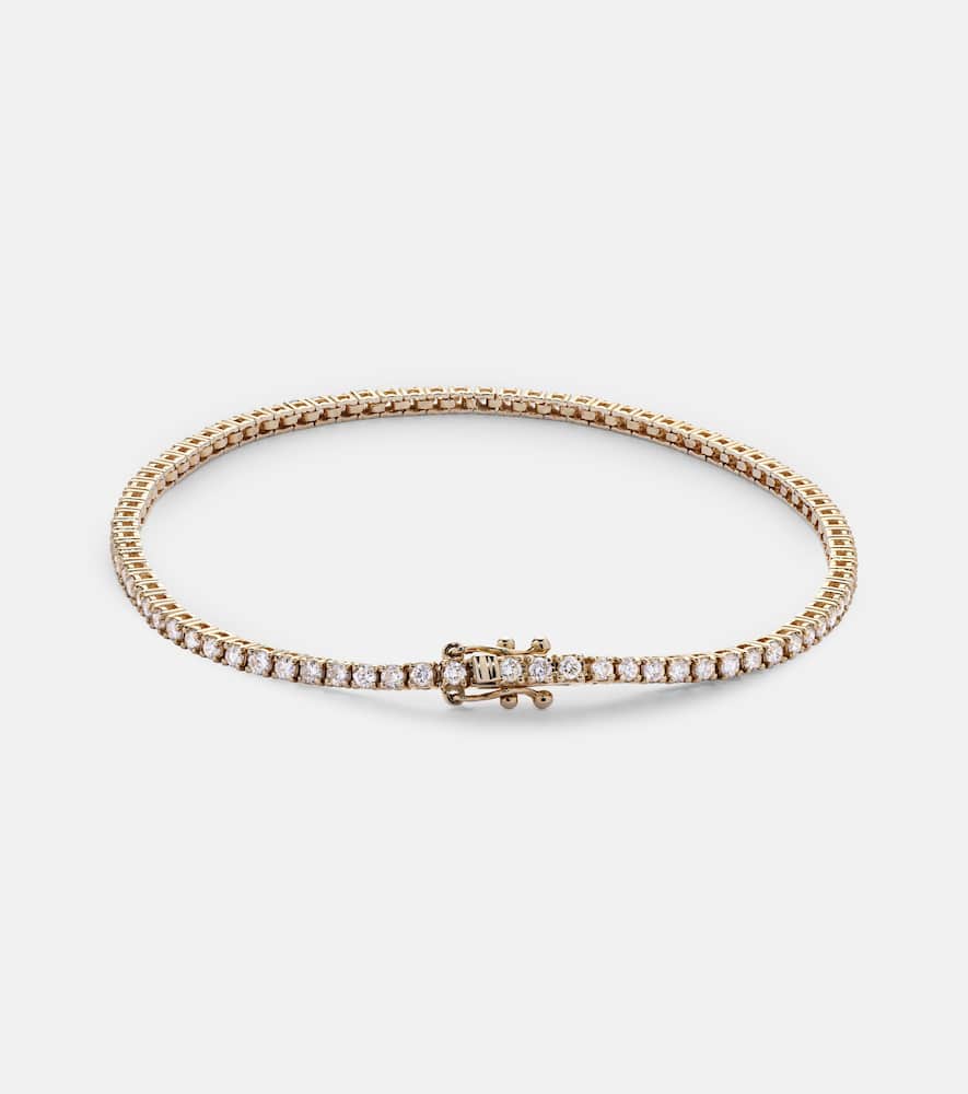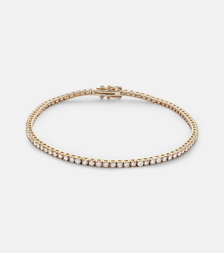 This bracelet is made in the USA from 14kt yellow gold. It features 1.02 carats of round-cut diamonds in a prong setting.