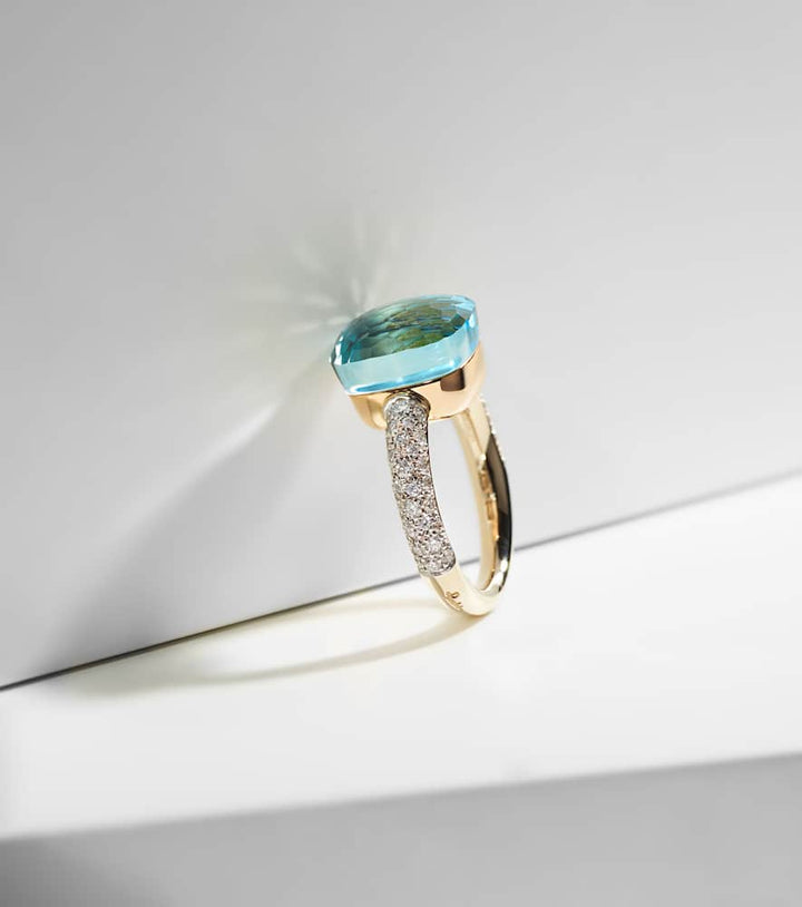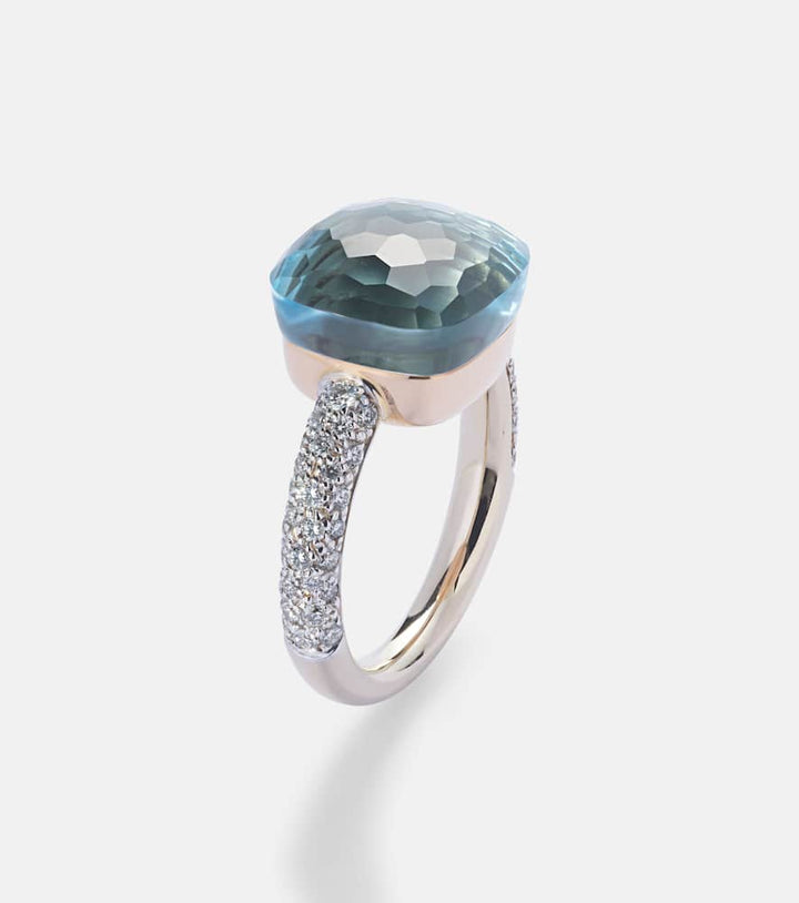 This Nudo 18kt gold ring with topaz and diamonds by Pomellato is a magnificent and opulent statement piece. Made in Italy from 18kt white and rose gold, this ring is a breathtaking masterpiece, featuring a total carat weight of 15 of topaz and 0.7 of diamonds. The design is a celebration of a sophisticated and graceful style and is perfect for adding high-end sparkle to any ensemble.