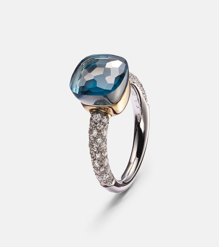 This Nudo 18kt gold ring with London blue topaz and diamonds by Pomellato is a magnificent and opulent statement piece. Made in Italy from 18kt white and rose gold, this ring is a breathtaking masterpiece, featuring a total carat weight of 0.70 of brilliant diamonds. The design is a celebration of a sophisticated and graceful style and is perfect for adding high-end sparkle to any ensemble.