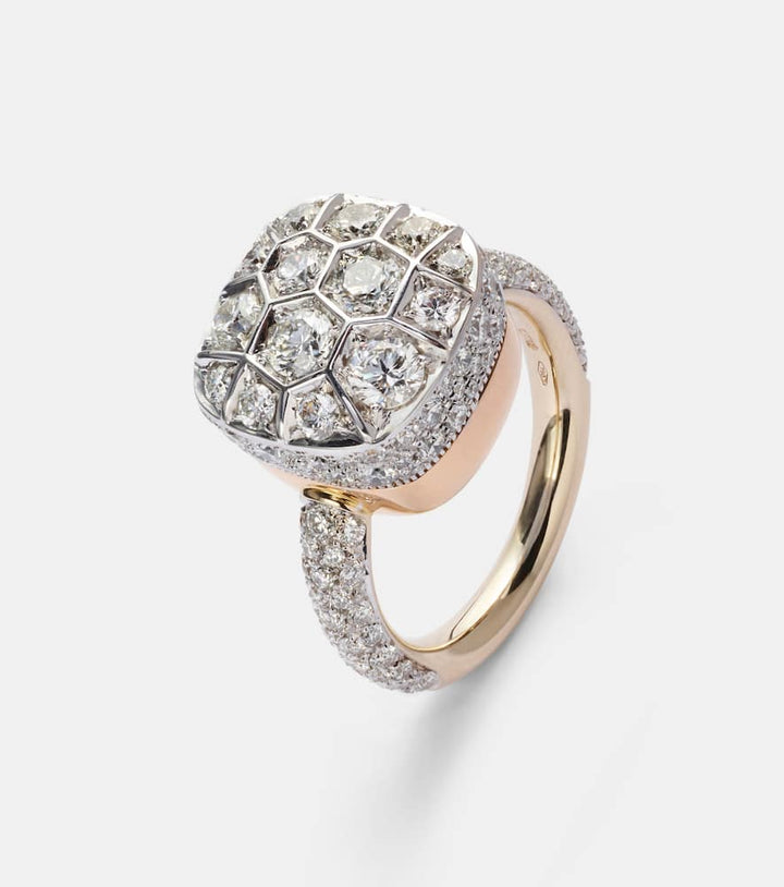 This ring is made in Italy from 18kt rose and white gold. It features 3.7 carats of round-cut diamonds in a bead and pavé setting.