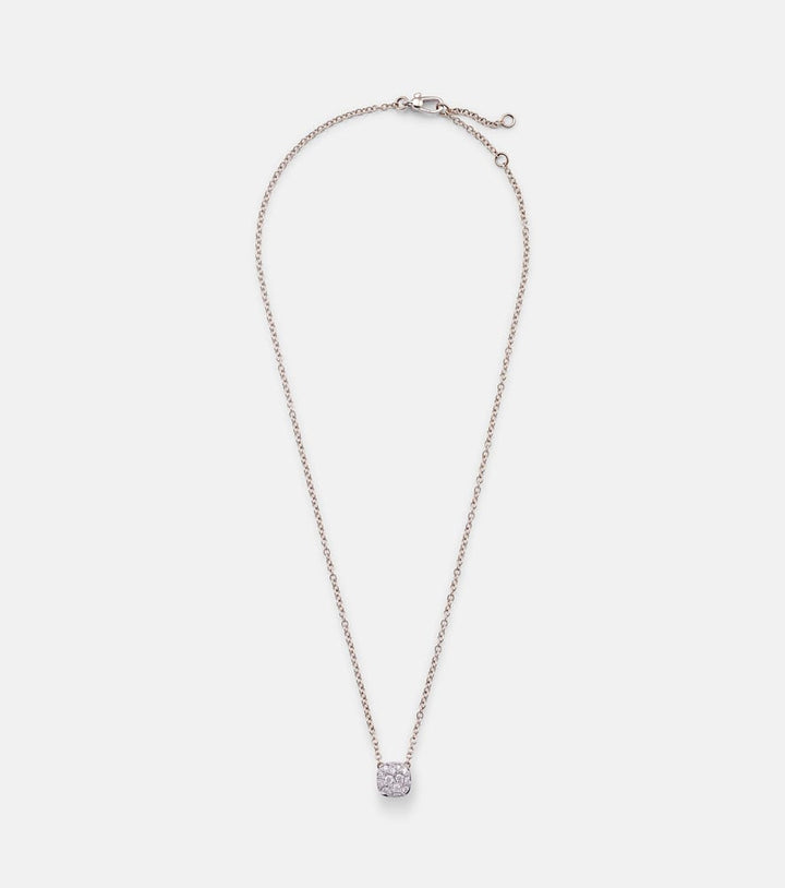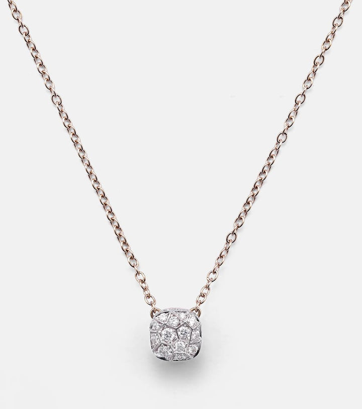 This Nudo Solitaire 18kt gold necklace with diamonds by Pomellato is a magnificent and opulent statement. Made in Italy from 18kt rose and white gold, this necklace is a breathtaking masterpiece, featuring a total carat weight of 0.84 of brilliant diamonds. The design is a celebration of a sophisticated and graceful style and is perfect for adding a touch of high-end glamour to your look. It can be worn on its own for a subtle statement or layered with other pieces for a bolder, more personalized style.